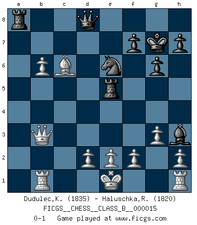 Last move : 0-1 2007 October 24 2:0:16 [Event "FICGS__CHESS__CLASS_B__000015"] [Site "FICGS"] [Date "2007.02.05"] [Round "1"] [White "Dudulec,Konstantin"] [Black "Haluschka,Rainer"] [Result "0-1"] [WhiteElo "1835"] [BlackElo "1820"] 1.c4 e5 2.Nc3 Nc6 3.g3 g6 4.Bg2 Bg7 5.Rb1 a5 6.a3 Nf6 7.b4 axb4 8.axb4 Ne7 9.Qb3 c6 10.Nf3 e4 11.Nd4 d5 12.cxd5 O-O 13.Bb2 Nexd5 14.Nxe4 Nxe4 15.Bxe4 Bh3 16.b5 Re8 17.Bf3 Nc7 18.Nxc6 bxc6 19.Bxg7 Kxg7 20.Bxc6 Re5 21.b6 Ne6 0-1 This chess game has been lost on time (started : 2007.02.05 8:42:51) English : Closed, 5.Rb1 Kingside Castling by player Black (move 12) Player Black won this chess game. Follow this game move after move (download)The King is a fighting piece. Use it ! (Wilhelm Steinitz) Schach ist die gewalttätigste aller Sportarten. (Garry Kasparov) Si tu oponente te ofrece un empate, trata de averiguar porque piensa él que esta en una posición peor. (Nigel Short) Seul un grand joueur sait à quel point il joue faiblement. (Xavier Tartacover) To be champion requires more than simply being a strong player; one has to be a strong human being as well. (Anatoly Karpov)