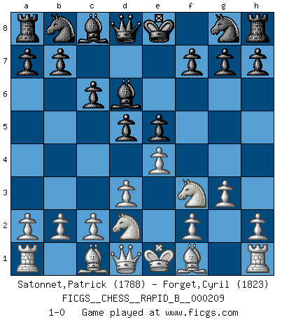 Last move : 1-0 2013 September 10 13:35:42 [Event "FICGS__CHESS__RAPID_B__000209"] [Site "FICGS"] [Date "2013.07.17"] [Round "1"] [White "Satonnet,Patrick"] [Black "Forget,Cyril"] [Result "1-0"] [WhiteElo "1788"] [BlackElo "1823"] 1.e4 c6 2.d3 d5 3.Nd2 e5 4.Ngf3 Bd6 5.g3 1-0 This chess game has been lost on time (started : 2013.07.17 21:17:33) Caro-Kann : Closed (Breyer) variation Player White won this chess game. Follow this game move after move (download)Best by test: 1. e4 (Bobby Fischer) Fischer machte Schach einfach zu einer aufregenden Sache, wann immer er sich ans Brett setzte. (Raymond Keene) El Ajedrez por encima de todo... ¡es una pelea!. (Emanuel Lasker) Un journaliste : 'Vous préférez avoir une dame de plus sur l'échiquier ou au lit ?' Boris Spassky : 'Ca dépend de la position.' Warrior pose battles inner weakness and wins focus. You see that there is no war within you. You're on your own side, and you are your own strength. (Terri Guillemets)