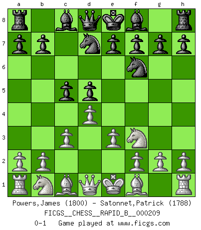 Last move : 0-1 2013 August 28 12:52:37 [Event "FICGS__CHESS__RAPID_B__000209"] [Site "FICGS"] [Date "2013.07.17"] [Round "1"] [White "Powers,James"] [Black "Satonnet,Patrick"] [Result "0-1"] [WhiteElo "1800"] [BlackElo "1788"] 1.d4 d5 2.Nf3 Nf6 3.e3 c5 4.c3 Nbd7 0-1 This chess game has been lost on time (started : 2013.07.17 21:17:33) Queen's pawn game Player Black won this chess game. Follow this game move after move (download)Chess is the art of analysis. (Mikhail Botvinnik) Ein Buch ist ein Spiegel; wenn ein Affe hineinsieht, so kann kein Apostel heraus gucken. (Georg Christoph Lichtenberg) El Ajedrez es en su esencia, un juego. En su forma, un arte. Y en su ejecución, una ciencia. (Baron Tassilo) Karpov est une pièce de musée. (Garry Kasparov) The Movers & Shakers of this world are those who play chess in the mornings and go to the disco in the evenings. (Dinesh De Silva)