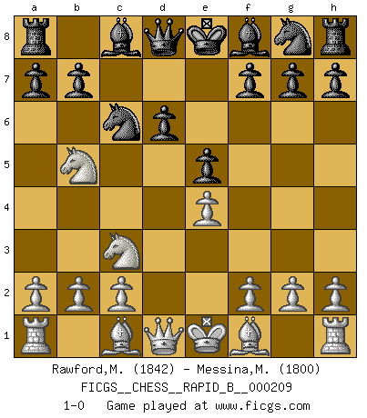 Last move : 1-0 2013 August 22 12:24:53 [Event "FICGS__CHESS__RAPID_B__000209"] [Site "FICGS"] [Date "2013.07.17"] [Round "1"] [White "Rawford,Mike"] [Black "Messina,Miguel Angel"] [Result "1-0"] [WhiteElo "1842"] [BlackElo "1800"] 1.e4 c5 2.Nf3 Nc6 3.d4 cxd4 4.Nxd4 e5 5.Nb5 d6 6.N1c3 1-0 This chess game has been lost on time (started : 2013.07.17 21:17:33) Sicilian : Labourdonnais-Loewenthal (Kalashnikov) variation Player White won this chess game. Follow this game move after move (download)When asked, -How is that you pick better moves than your opponents?, I responded: I'm very glad you asked me that, because, as it happens, there is a very simple answer. I think up my own moves, and I make my opponent think up his. (Alexander Alekhine) Ich trinke, ich rauche, ich spiele, ich liebe Frauen aber Fernschach ist ein Laster, das ich nicht habe. (Mikhail Nekhemyevich Tal) Cuando tengas duda... ¡juega al Ajedrez!. (Tevis) En blitz, le Cavalier l'emporte sur le Fou. (Vlastimil Hort) Statistics can be made to prove anything - even the truth. (Author unknown)