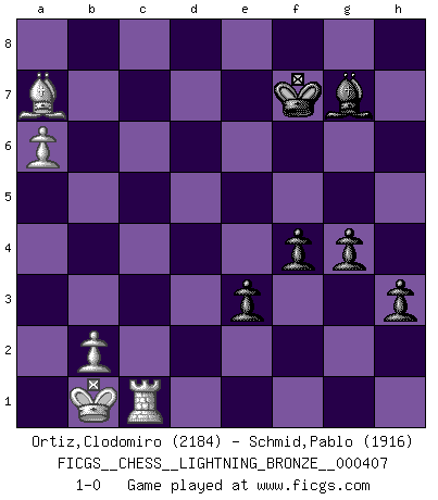 Last move : 1-0 2013 July 18 2:7:22 [Event "FICGS__CHESS__LIGHTNING_BRONZE__000407"] [Site "FICGS"] [Date "2013.07.18"] [Round "1"] [White "Ortiz,Clodomiro"] [Black "Schmid,Pablo"] [Result "1-0"] [WhiteElo "2184"] [BlackElo "1916"] 1.e4 c5 2.Nf3 d6 3.d4 cxd4 4.Nxd4 Nf6 5.Nc3 g6 6.Be3 Bg7 7.f3 O-O 8.Qd2 Nc6 9.O-O-O d5 10.Qe1 e5 11.Nxc6 bxc6 12.exd5 Nxd5 13.Bc4 Be6 14.Ne4 Qc7 15.Bc5 Rfd8 16.Qh4 h6 17.g4 Rd7 18.Ba3 Rad8 19.Nc5 e4 20.Nxd7 Qf4+ 21.Kb1 Rxd7 22.Bxd5 Rxd5 23.Rxd5 cxd5 24.fxe4 dxe4 25.Qg3 Qd2 26.Qd6 Qxd6 27.Bxd6 Bxg4 28.c4 f5 29.c5 g5 30.h3 Be2 31.c6 f4 32.c7 Ba6 33.Rd1 Kf7 34.Bc5 Bc8 35.Bxa7 Bxh3 36.Rd8 h5 37.c8Q Bxc8 38.Rxc8 h4 39.a4 g4 40.a5 h3 41.Rc1 e3 42.a6 1-0 This chess game has been lost on time (started : 2013.07.18 0:53:31) Sicilian : Dragon, Yugoslav attack, 7...O-O Kingside Castling by player Black (move 7) Queenside Castling by player White (move 9) Promotion Queen by player White (move 37) Player White won this chess game. Follow this game move after move (download)Daring ideas are like Chess men moved forward. They may be beaten, but they may start a winning game. (Johann Wolfgang von Goethe) Nur ein wirklich starker Spieler weiß wie schwach er spielt. (Savielly Grigorievitsch Tartakower) El jugador táctico debe saber que hacer cuando algo se debe de hacer. El estratégico debe saber que hacer cuando nada se debe de hacer. (Savielly Tartakover) Ce n'est pas pour s'amuser qu'il joue aux échecs : il célèbre un culte. (Vladimir Nabokov) Life is like a ten-speed bicycle: most of us have gears we never use. (Charles M. Schulz)