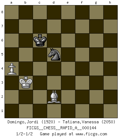 Last move : 1/2-1/2 2013 November 19 21:29:4 [Event "FICGS__CHESS__RAPID_A__000144"] [Site "FICGS"] [Date "2013.07.18"] [Round "1"] [White "Domingo,Jordi"] [Black "Tatiana,Vanessa"] [Result "1/2-1/2"] [WhiteElo "1920"] [BlackElo "2050"] 1.e4 c5 2.Nf3 d6 3.d4 cxd4 4.Nxd4 Nf6 5.Nc3 a6 6.Be3 e5 7.Nb3 Be7 8.f3 Be6 9.Qd2 Nbd7 10.g4 h6 11.O-O-O b5 12.h4 Nb6 13.Qf2 Nfd7 14.Kb1 Nc4 15.Bc1 Qb6 16.Qe1 Qc6 17.Bxc4 bxc4 18.Na5 Qc7 19.Nd5 Bxd5 20.exd5 c3 21.Nc6 cxb2 22.Bxb2 Nb8 23.Nxe7 Qxe7 24.f4 f6 25.g5 hxg5 26.hxg5 Rxh1 27.Qxh1 Nd7 28.Qh5+ Kd8 29.fxe5 fxe5 30.Rf1 Qe8 31.Qf7 Rb8 32.Qxg7 Qh5 33.g6 Qg4 34.Qh6 Kc7 35.g7 Qg2 36.Rd1 Qg4 37.Rh1 Qg2 38.Qh8 Nf6 39.Ka1 Rg8 40.Rb1 Qxg7 41.Qh4 Rb8 42.Qc4+ Kd7 43.Qxa6 Ke7 44.Rh1 Rh8 45.Rf1 Nd7 46.Ba3 Rh6 47.Qc6 e4 48.Bb2 Qg2 49.Rb1 e3 50.Bc1 Rh1 51.Bxe3 Qg7+ 52.c3 Rxb1+ 53.Kxb1 Qe5 54.Bc1 Nc5 55.Kb2 Nd3+ 56.Kc2 Qe2+ 57.Kb1 Qe1 58.Qc7+ Ke8 59.Qc8+ Ke7 60.Qe6+ Qxe6 61.dxe6 Nc5 62.Be3 Na4 63.c4 d5 64.cxd5 Nc3+ 65.Kc2 Nxd5 66.Bd2 Kxe6 67.a4 Kd6 68.Kb3 Kc5 69.Be1 Kc6 70.Bd2 1/2-1/2 Sicilian : Najdorf, Byrne (English) attack Queenside Castling by player White (move 11) 10 pieces endgame at move 53 : White KQBPPP , Black KQNP WHITE : King + 1 Queen 1 Bishop 3 Pawns BLACK : King + 1 Queen 1 Knight 1 Pawn 9 pieces endgame at move 60 : White KBPPP , Black KQNP WHITE : King + 1 Bishop 3 Pawns BLACK : King + 1 Queen 1 Knight 1 Pawn 8 pieces endgame at move 61 : White KBPPP , Black KNP WHITE : King + 1 Bishop 3 Pawns BLACK : King + 1 Knight 1 Pawn 7 pieces endgame at move 64 : White KBPPP , Black KN WHITE : King + 1 Bishop 3 Pawns BLACK : King + 1 Knight 6 pieces endgame at move 65 : White KBPP , Black KN WHITE : King + 1 Bishop 2 Pawns BLACK : King + 1 Knight 5 pieces endgame at move 66 : White KBP , Black KN WHITE : King + 1 Bishop 1 Pawn BLACK : King + 1 Knight This chess game ended in a draw. Follow this game move after move (download)It began to feel as though you were playing against Chess itself. - On playing against Robert Fischer. (Walter Shipman) Als er Schachweltmeister wurde ließ er praktisch alle stärksten Sovietspieler für sich arbeiten. Wenn ein auch nur mittelmässiger Meister ein Spezialist für eine bestimmte Eröffnung war, wurde er von Karpov gerufen. Das wurde alles geheim gehalten. (Mikhail Moiseyevich Botvinik) Me siento como si fuera una pieza en una partida de Ajedrez, cuando mi oponente me indica: esa pieza no puede ser movida. (Soren Kierkegaard) Il s'avisa de me proposer d'apprendre les échecs qu'il jouait un peu... me voilà forcené des échecs. J'achète un échiquier, je m'enferme dans ma chambre, j'y passe des jours et des nuits à vouloir apprendre par cur toutes les parties. (Jean-Jacques Rousseau, Confessions) Who needs drugs and alcohol if he can play Big Chess at FICGS ? (Heinz-Georg Lehnhoff)