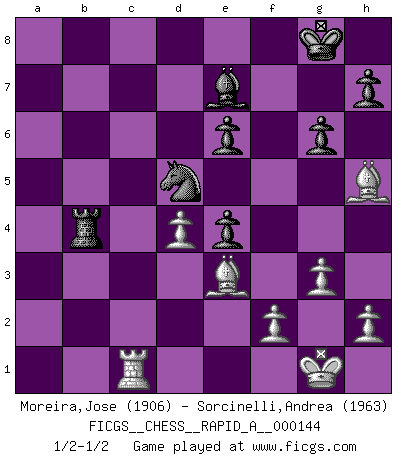 Last move : 1/2-1/2 2013 September 24 0:45:12 [Event "FICGS__CHESS__RAPID_A__000144"] [Site "FICGS"] [Date "2013.07.18"] [Round "1"] [White "Moreira,Jose"] [Black "Sorcinelli,Andrea"] [Result "1/2-1/2"] [WhiteElo "1906"] [BlackElo "1963"] 1.e4 c5 2.Nf3 d6 3.d4 cxd4 4.Nxd4 Nf6 5.Nc3 a6 6.Be3 e5 7.Nb3 Be6 8.Be2 Be7 9.Qd3 O-O 10.O-O Nc6 11.a3 Na5 12.Nd5 Nxb3 13.Qxb3 Nxe4 14.Qxb7 Bxd5 15.Qxd5 Nf6 16.Qd3 d5 17.c3 Qc7 18.b4 Rfc8 19.Rac1 a5 20.Rfd1 Qd6 21.Qb1 Qe6 22.Qb3 axb4 23.axb4 Rab8 24.Bf3 d4 25.Qxe6 fxe6 26.cxd4 e4 27.Be2 Rxc1 28.Rxc1 Rxb4 29.g3 Nd5 30.Bh5 g6 1/2-1/2 Sicilian : Najdorf, Byrne (English) attack Kingside Castling by player Black (move 9) Kingside Castling by player White (move 10) This chess game ended in a draw. Follow this game move after move (download)In the perfect Chess combination as in a first-rate short story, the whole plot and counter-plot should lead up to a striking finale, the interest not being allayed until the very last moment. (Yates and Winter) Früher wurde jeder komplizierte Zug, jedes interessante Opfer mit großem Beifall und Enthusiasmus aufgenommen. Heute schaltet man einfach seinen Fritz an, und man kann sehen, was los ist, ob der Zug geht oder nicht. (Vladimir Kramnik) Un entendimiento a fondo de las continuaciones típicas del mate, hace de las combinaciones de sacrificio mas complicadas conducirlas a ellas no solo sin dificultad, sino casi de una manera natural. (Siegbert Tarrasch) Un journaliste : 'Vous préférez avoir une dame de plus sur l'échiquier ou au lit ?' Boris Spassky : 'Ca dépend de la position.' If only people were all showed a certain minimum level of niceness; if only people didn't retract verbal draw offers (without draw box ticked) on ficgs; if only people didn't kill; if only people didn't run concentration / extermination camps, if only people didn't drop nuclear bombs on Hiroshima and Nagasaki, and so on - it would be a much more beautiful world. But sadly, things are not so... (Normajean Yates)