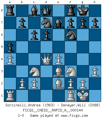 Last move : 1-0 2013 October 24 17:30:56 [Event "FICGS__CHESS__RAPID_A__000144"] [Site "FICGS"] [Date "2013.07.18"] [Round "1"] [White "Sorcinelli,Andrea"] [Black "Denayer,Will"] [Result "1-0"] [WhiteElo "1963"] [BlackElo "2088"] 1.e4 d6 2.d4 Nf6 3.Nc3 Nbd7 4.Nf3 e5 5.Be2 c6 6.O-O Be7 7.a4 a5 8.h3 O-O 9.Be3 exd4 10.Qxd4 1-0 This chess game has been lost on time (started : 2013.07.18 18:51:0) Pirc defense Kingside Castling by player White (move 6) Kingside Castling by player Black (move 8) Player White won this chess game. Follow this game move after move (download)Chess demands total concentration. (Bobby Fischer) Schach ist ein Reich, wo sich die menschliche Phantasie frei entfalten kann. (David Bronstein) El Ajedrez demanda una total concentración. (Bobby Fischer) Les échecs, c'est la lutte contre l'erreur. (Johannes Zukertort) Thibault, I ask for draw. Game 13876. - Sorry Ilmars, you won. (FICGS chat)