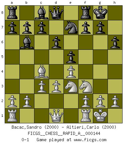 Last move : 0-1 2013 September 4 13:19:5 [Event "FICGS__CHESS__RAPID_A__000144"] [Site "FICGS"] [Date "2013.07.18"] [Round "1"] [White "Bacac,Sandro"] [Black "Altieri,Carlo"] [Result "0-1"] [WhiteElo "2000"] [BlackElo "2000"] 1.e4 e5 2.Nf3 Nc6 3.Bc4 Bc5 4.d3 Nf6 5.Nc3 d6 6.Bg5 h6 7.Bxf6 Qxf6 8.Nd5 Qd8 9.c3 Ne7 10.Ne3 O-O 11.O-O Bb6 0-1 This chess game has been lost on time (started : 2013.07.18 18:51:0) Giuoco Pianissimo : Canal variation Kingside Castling by player Black (move 10) Kingside Castling by player White (move 11) Player Black won this chess game. Follow this game move after move (download)The most important feature of the Chess position is the activity of the pieces. This is absolutely fundamental in all phases of the game: Opening, Middlegame and especially Endgame. The primary constraint on a piece's activity is the Pawn structure. (Michael Stean) Die unerbitterlichsten Regeln im Schach sind die Ausnahmen. (Savielly Grigorievitsch Tartakower) Las piezas de Ajedrez son los bloques del alfabeto que moldean los pensamientos; y esos pensamientos, aunque hagan un diseño visual en el tablero, expresan abstractamente su belleza como un poema. (Marcel Duchamp) Même si l'adversaire joue le coup analysé précédemment, recommencez l'analyse en voyant la nouvelle position. Première règle de Blumenfeld Whenever people agree with me, I always feel I must be wrong. (Oscar Wilde)