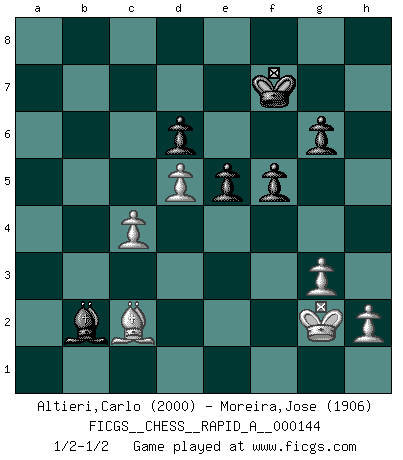 Last move : 1/2-1/2 2013 September 2 15:19:54 [Event "FICGS__CHESS__RAPID_A__000144"] [Site "FICGS"] [Date "2013.07.18"] [Round "1"] [White "Altieri,Carlo"] [Black "Moreira,Jose"] [Result "1/2-1/2"] [WhiteElo "2000"] [BlackElo "1906"] 1.e4 c5 2.Nf3 d6 3.Nc3 Nf6 4.d4 cxd4 5.Nxd4 a6 6.Be2 e5 7.Nb3 Be6 8.f4 Be7 9.O-O O-O 10.f5 Bd7 11.Be3 Bc6 12.Bf3 b5 13.a3 Nbd7 14.Bf2 Qc7 15.Qd3 a5 16.Nd5 Bxd5 17.exd5 Rfc8 18.c3 Nb6 19.Nd2 Nc4 20.Qc2 Nxd2 21.Qxd2 Bd8 22.Qc2 Rab8 23.Rfd1 Qd7 24.Bh4 b4 25.axb4 axb4 26.c4 b3 27.Qd3 Qc7 28.Be2 Nd7 29.Bf2 Nc5 30.Bxc5 Qxc5+ 31.Kh1 Bf6 32.Qe4 Ra8 33.Rxa8 Rxa8 34.g3 Qa7 35.Rb1 Bd8 36.Kg2 Bb6 37.Qd3 Qa2 38.Bd1 Bd4 39.Bxb3 Ra3 40.Bxa2 Rxd3 41.Kh3 Rd2 42.Bb3 g6 43.Ba4 Bxb2 44.fxg6 hxg6 45.Rd1 Rxd1 46.Bxd1 f5 47.Kg2 Kf7 48.Bc2 1/2-1/2 Sicilian Kingside Castling by player White (move 9) Kingside Castling by player Black (move 9) This chess game ended in a draw. Follow this game move after move (download)Good positions don't win games, good moves do. (Gerald Abrahams) Wenn ich einen Club besuche, sind die Spieler stumm vor Staunen. (José Raúl Capablanca) Cuando tu no sabes absolutamente que mas hacer, es tiempo de entrar en pánico. (John van der Wiel) On a dit que l'homme se distingue de l'animal par le fait qu'il achète plus de livres qu'il ne peut en lire. Je voudrais suggérer qu'inclure à la liste des livres quelques livres d'échecs rendrait la distinction manifeste. (Edward Lasker) The obstacle is the path. (Zen proverb)