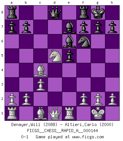 Last move : 0-1 2013 October 13 16:9:25 [Event "FICGS__CHESS__RAPID_A__000144"] [Site "FICGS"] [Date "2013.07.18"] [Round "1"] [White "Denayer,Will"] [Black "Altieri,Carlo"] [Result "0-1"] [WhiteElo "2088"] [BlackElo "2000"] 1.e4 c5 2.Nf3 d6 3.d4 Nf6 4.dxc5 Nxe4 5.cxd6 Nc6 6.Na3 Qa5+ 7.c3 exd6 8.Nc4 Qd8 9.Ne3 Be6 10.Nd5 Be7 11.Bc4 O-O 12.O-O Ne5 13.Nxe5 dxe5 14.Re1 Nf6 0-1 Sicilian Kingside Castling by player Black (move 11) Kingside Castling by player White (move 12) Player Black won this chess game. Follow this game move after move (download)No other master has such a terrific will to win. At the board he radiates danger, and even the strongest opponents tend to freeze, like rabbits when they smell a panther. Even his weaknesses are dangerous. As white, his opening game is predictable - you can make plans against it - but so strong that your plans almost never work. In the middle game his precision and invention are fabulous, and in the end game you simply cannot beat him. (Anonymous German Expert) Wenn du nicht weißt was du tun sollst, warte bis dein Gegner eine Idee hat. Sie wird sicher schlecht sein. (Siegbert Tarrasch) El Ajedrez es en su esencia, un juego. En su forma, un arte. Y en su ejecución, una ciencia. (Baron Tassilo) Aux échecs, l'amour-propre est satisfait quand on remporte la victoire, mais il n'y a pas de honte à être battu. (Benjamin Franklin) Every vice is only an exaggeration of a necessary and virtuous function. (Ralph Waldo Emerson, Journals 1936)