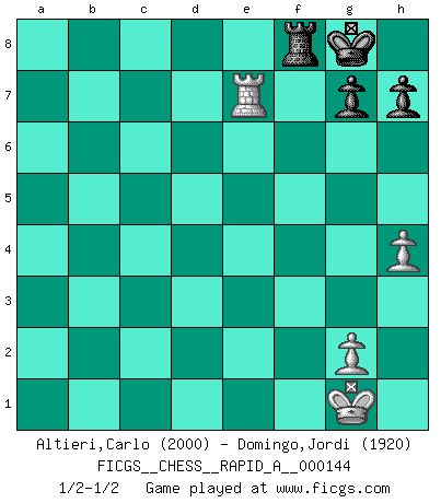 Last move : 1/2-1/2 2013 August 30 16:40:40 [Event "FICGS__CHESS__RAPID_A__000144"] [Site "FICGS"] [Date "2013.07.18"] [Round "1"] [White "Altieri,Carlo"] [Black "Domingo,Jordi"] [Result "1/2-1/2"] [WhiteElo "2000"] [BlackElo "1920"] 1.e4 e5 2.Nf3 f5 3.Nxe5 Nf6 4.d4 fxe4 5.Bg5 d6 6.Nc4 Be7 7.Nc3 O-O 8.Ne3 Nbd7 9.Bc4+ Kh8 10.O-O c6 11.f3 d5 12.Bb3 exf3 13.Qxf3 Ng8 14.Bxe7 Nxe7 15.Qg3 Nf6 16.Ne2 Ne4 17.Qh4 Ng8 18.Qxd8 Rxd8 19.Rad1 Ngf6 20.c4 dxc4 21.Nxc4 Be6 22.Nc3 Nd6 23.Nxd6 Bxb3 24.Nxb7 Rdb8 25.axb3 Rxb7 26.d5 cxd5 27.Nxd5 Nxd5 28.Rxd5 Rxb3 29.Rd7 Rxb2 30.Rxa7 R2b8 31.Re7 Rf8 32.Rxf8+ Rxf8 33.h4 Kg8 1/2-1/2 Latvian counter-gambit Kingside Castling by player Black (move 7) Kingside Castling by player White (move 10) 10 pieces endgame at move 30 : White KRRPP , Black KRRPP WHITE : King + 2 Rooks 2 Pawns BLACK : King + 2 Rooks 2 Pawns 9 pieces endgame at move 32 : White KRRPP , Black KRPP WHITE : King + 2 Rooks 2 Pawns BLACK : King + 1 Rook 2 Pawns 8 pieces endgame at move 32 : White KRPP , Black KRPP WHITE : King + 1 Rook 2 Pawns BLACK : King + 1 Rook 2 Pawns This chess game ended in a draw. Follow this game move after move (download)By playing at Chess then, we may learn: First: Foresight... Second: Circumspection... Third: Caution... And lastly, we learn by Chess the habit of not being discouraged by present bad appearances in the state of our affairs, the habit of hoping for a favorable chance, and that of persevering in the secrets of resources. (Benjamin Franklin) Die Partien sind immer verschieden, die Interviews immer die gleichen. (Garry Kasparov) Cuando tu casa esta en llamas, no puedes ser molestado por tus vecinos. O, como decinos en Ajedrez, si tu Rey esta bajo ataque, no te preocupa perder un Peón del lado de la Reina. (Gary Kasparov) Shah mat. Le roi est mort. Cri de fierté d'un joueur venant de terrasser son adversaire, courtoisement, sans effusion de sang. Perseverance does not equal worthiness. Next time you want to get my attention, wear something fun. Low-riding jeans are hot. (Gregory House, House M.D.)