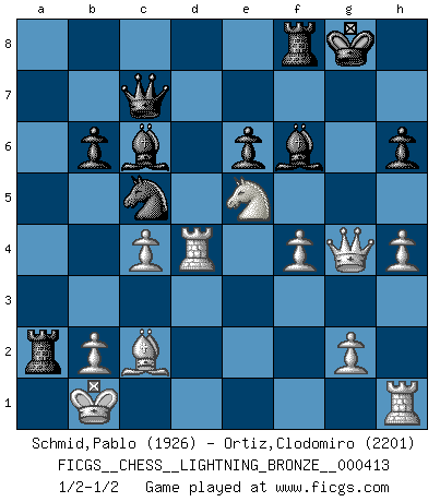 Last move : 1/2-1/2 2013 July 19 22:39:27 [Event "FICGS__CHESS__LIGHTNING_BRONZE__000413"] [Site "FICGS"] [Date "2013.07.19"] [Round "1"] [White "Schmid,Pablo"] [Black "Ortiz,Clodomiro"] [Result "1/2-1/2"] [WhiteElo "1926"] [BlackElo "2201"] 1.e4 e6 2.d4 d5 3.Nc3 Nf6 4.Bg5 dxe4 5.Nxe4 Be7 6.Bxf6 Bxf6 7.Nf3 O-O 8.Qd2 Nd7 9.O-O-O Be7 10.Bd3 b6 11.h4 Bb7 12.Qe2 c5 13.dxc5 Qc7 14.Neg5 h6 15.cxb6 Qf4+ 16.Kb1 Nc5 17.Bh7+ Kh8 18.Rd4 Qb8 19.Ne5 Bf6 20.f4 axb6 21.Bd3 Qc7 22.c3 Bd5 23.c4 Bc6 24.Bc2 Rxa2 25.Ngxf7+ Kg8 26.Nxh6+ gxh6 27.Qg4+ Kh8 28.Ng6+ Kg8 29.Ne5 Kh8 30.Ng6+ Kg8 31.Ne5 1/2-1/2 French : Burn variation Kingside Castling by player Black (move 7) Queenside Castling by player White (move 9) This chess game ended in a draw. Follow this game move after move (download)Chess is a fairy tale of 1001 blunders. (Savielly Tartakower) Im Reiche der Wirklichkeit ist man nie so glücklich wie im Reiche der Gedanken. (Arthur Schopenhauer) ¿Se han dado cuenta de que Fischer casi nunca ha tenido piezas malas? El las intercambia y las piezas malas se quedan con sus oponenets. (Yuri Balashov) Votre seul travail dans les ouvertures est d'obtenir un milieu de partie jouable. (Lajos Portish) When it is a question of money, everybody is of the same religion. (Voltaire)