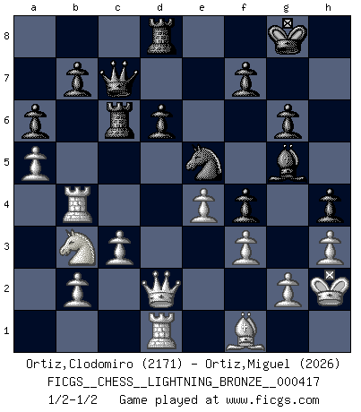 Last move : 1/2-1/2 2013 July 21 3:52:22 [Event "FICGS__CHESS__LIGHTNING_BRONZE__000417"] [Site "FICGS"] [Date "2013.07.21"] [Round "1"] [White "Ortiz,Clodomiro"] [Black "Ortiz,Miguel"] [Result "1/2-1/2"] [WhiteElo "2171"] [BlackElo "2026"] 1.e4 c5 2.Nf3 d6 3.d4 cxd4 4.Nxd4 Nf6 5.Nc3 a6 6.Be3 e5 7.Nb3 Be6 8.f3 h5 9.Be2 Nbd7 10.O-O Rc8 11.a4 Be7 12.Rf2 Qc7 13.Bd3 O-O 14.a5 h4 15.Bf1 Rfe8 16.Rd2 Nh5 17.Na4 Qd8 18.Nb6 Rc7 19.Nd5 Bxd5 20.Rxd5 Nf4 21.Bxf4 exf4 22.c3 Ne5 23.h3 Bf8 24.Ra4 g6 25.Nd2 Qc8 26.Kh2 Rd8 27.Qe1 Be7 28.Nb3 Qd7 29.Rb4 Bf6 30.Rbd4 Qe6 31.Qd1 Rc6 32.Kh1 Qe7 33.Qd2 Bg5 34.Qf2 Bf6 35.Rd1 Qc7 36.Qd2 Bg5 37.Kg1 Kg7 38.Kh2 Qe7 39.Be2 Bf6 40.Rd4 Bg5 41.Kg1 Kg8 42.Rd5 Kg7 43.Kh1 Qc7 44.Rd4 Qe7 45.Bd3 Kg8 46.Rd5 Kg7 47.Bf1 Qc7 48.Be2 Qe7 49.Kg1 Qc7 50.Bf1 Kf8 51.Qd4 Kg7 52.Kh2 Bf6 53.Qd2 Qe7 54.Kh1 Bg5 55.Rd4 Qe6 56.Rb4 Qc8 57.Kg1 Qc7 58.Kh2 Kg8 1/2-1/2 Sicilian : Najdorf, Byrne (English) attack Kingside Castling by player White (move 10) Kingside Castling by player Black (move 13) This chess game ended in a draw. Follow this game move after move (download)The Chess pieces are the block alphabet which shapes thoughts; and these thoughts, although making a visual design on the chessboard, express their beauty abstractly, like a poem. (Marcel Duchamp) Ich organisiere ein großes Turnier, was mich etwa 120000 Dollar kostet. Ich denke, das ist das erste Mal in der Schachgeschichte, daß ein Schachgroßmeister auch als Mäzen auftritt. (Miguel Najdorf) Una victoria por una combinación errónea, aunque sea espectacular, me llena de horror artístico. (Wilhelm Steinitz) La tactique, c'est ce que vous faites quand il y a quelque chose à faire; la stratégie, c'est ce que vous faites quand il n'y a rien à faire. (Savielli Tartacower) Horse racing is animated roulette. (Roger Kahn)