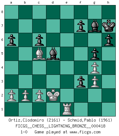 Last move : 1-0 2013 July 21 4:46:31 [Event "FICGS__CHESS__LIGHTNING_BRONZE__000418"] [Site "FICGS"] [Date "2013.07.21"] [Round "1"] [White "Ortiz,Clodomiro"] [Black "Schmid,Pablo"] [Result "1-0"] [WhiteElo "2161"] [BlackElo "1961"] 1.e4 c5 2.Nf3 d6 3.d4 cxd4 4.Nxd4 Nf6 5.Nc3 g6 6.Be3 Bg7 7.f3 O-O 8.Qd2 Nc6 9.O-O-O d5 10.Qe1 e5 11.Nxc6 bxc6 12.exd5 Nxd5 13.Bc4 Be6 14.Ne4 Qc7 15.Bc5 Rfd8 16.Qh4 h6 17.g4 Rd7 18.Ba3 Rad8 19.Nc5 e4 20.Nxd7 Qf4+ 21.Kb1 Rxd7 22.Bxd5 Rxd5 23.Rxd5 Bxd5 24.Qg3 Qxg3 25.hxg3 exf3 26.Bc5 a6 27.Re1 g5 28.Kc1 Kh7 29.Kd2 1-0 This chess game has been lost on time (started : 2013.07.21 3:56:19) Sicilian : Dragon, Yugoslav attack, 7...O-O Kingside Castling by player Black (move 7) Queenside Castling by player White (move 9) Player White won this chess game. Follow this game move after move (download)When you don't know what to play, wait for an idea to come into your opponent's mind. You may be sure that idea will be wrong. (Siegbert Tarrasch) Du kannst im Schach nur gut werden, wenn du das Spiel liebst. (Robert James Fischer) Solo los afeminados hacen el Enroque. (Rob Sillars) Il n'y a pas de prix trop élevé au scalp de l'ennemi. (Koblentz) The difference between perseverance and obstinacy is that one comes from a strong will, and the other from a strong won't. (Henry Ward Beecher)
