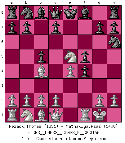 Last move : 1-0 2013 August 14 17:33:29 [Event "FICGS__CHESS__CLASS_E__000166"] [Site "FICGS"] [Date "2013.07.21"] [Round "1"] [White "Rezack,Thomas"] [Black "Mathakiya,Azaz"] [Result "1-0"] [WhiteElo "1351"] [BlackElo "1400"] 1.e4 c5 2.f4 e5 3.Nf3 f5 4.Bc4 exf4 5.Ne5 Nh6 6.O-O 1-0 Sicilian : Grand Prix attack Kingside Castling by player White (move 6) Player White won this chess game. Follow this game move after move (download)In Chess, just as in life, today's bliss may be tomorrow's poison. (Assaic) Wenn du gegen Bobby spielst, ist es keine Frage von gewinnen oder verlieren. Es ist eine Frage des Überlebens. (Boris Vassilievich Spassky) Combinaciones deslumbrantes son para la mayoría, mover madera es para los pocos. (Georg Kieninger) On n'a jamais que l'âge auquel on a commence à jouer aux échecs car après on cesse de vieillir. (Capablanca) Beep ! (R2D2 in Star Wars ep.3)