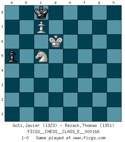 Last move : 1-0 2014 January 4 12:39:58 [Event "FICGS__CHESS__CLASS_E__000166"] [Site "FICGS"] [Date "2013.07.21"] [Round "1"] [White "Goti,Javier"] [Black "Rezack,Thomas"] [Result "1-0"] [WhiteElo "1323"] [BlackElo "1351"] 1.c4 g6 2.Nc3 Bg7 3.d4 Nf6 4.g3 Nc6 5.e3 O-O 6.Nge2 d6 7.Bg2 e5 8.O-O Bg4 9.h3 Nd7 10.hxg4 exd4 11.exd4 Rb8 12.g5 Nb6 13.b3 Re8 14.Be3 Qd7 15.f4 Rxe3 16.Rc1 Rbe8 17.Rf3 Rxf3 18.Bxf3 Qe6 19.d5 Qe3+ 20.Kg2 Ne7 21.g4 Nd7 22.Ne4 f5 23.Rc3 Bxc3 24.N4xc3 fxg4 25.Bxg4 Nc5 26.Qd4 Nf5 27.Bxf5 gxf5 28.Qxe3 Rxe3 29.Kf2 Rh3 30.Kg2 Rh5 31.Ng3 Rh4 32.Nxf5 Rxf4 33.Nh6+ Kg7 34.Nb5 Ne4 35.Nxc7 Nxg5 36.Kg3 Rf6 37.Ng4 Ne4+ 38.Kg2 Rg6 39.Kf3 Nd2+ 40.Kf4 h5 41.Ne3 a6 42.Nf5+ Kf8 43.Ne6+ Kf7 44.Nxd6+ Ke7 45.Nxb7 Rg4+ 46.Kf5 Ne4 47.Nf4 Nd6+ 48.Nxd6 Kxd6 49.Nxh5 Rg2 50.Nf6 Rxa2 51.Ne4+ Kd7 52.Nc5+ Kd6 53.Ne4+ Ke7 54.d6+ Kd8 55.c5 Rb2 56.c6 Rxb3 57.Ke6 Rb6 58.c7+ Kc8 59.Ke7 Rxd6 60.Kxd6 a5 61.Nc5 1-0 English Opening Kingside Castling by player Black (move 5) Kingside Castling by player White (move 8) 10 pieces endgame at move 48 : White KNPPPP , Black KRPP WHITE : King + 1 Knight 4 Pawns BLACK : King + 1 Rook 2 Pawns 9 pieces endgame at move 49 : White KNPPPP , Black KRP WHITE : King + 1 Knight 4 Pawns BLACK : King + 1 Rook 1 Pawn 8 pieces endgame at move 50 : White KNPPP , Black KRP WHITE : King + 1 Knight 3 Pawns BLACK : King + 1 Rook 1 Pawn 7 pieces endgame at move 56 : White KNPP , Black KRP WHITE : King + 1 Knight 2 Pawns BLACK : King + 1 Rook 1 Pawn 6 pieces endgame at move 59 : White KNP , Black KRP WHITE : King + 1 Knight 1 Pawn BLACK : King + 1 Rook 1 Pawn 5 pieces endgame at move 60 : White KNP , Black KP WHITE : King + 1 Knight 1 Pawn BLACK : King + 1 Pawn Player White won this chess game. Follow this game move after move (download)Chess is war over the board. The object is to crush the opponents mind. (Bobby Fischer) Der vorletzte Fehler gewinnt. (Savielly Grigorievitsch Tartakower) Yo tuve un dolor de muelas en la primer partida. En el segundo juego, tuve un dolor de cabeza. En el tercero, tuve un ataque de reumatísmo. En la cuarta partida, no me sentía muy bien. ¿Y en el quinto juego? Bueno, ¿que acaso uno tiene que ganar todos los juegos?. (Siegbert Tarrasch) Il vaut mieux sacrifier les pièces de l'adversaire. (Xavier Tartacover) Indecision is the key to flexibility. (Unknown)