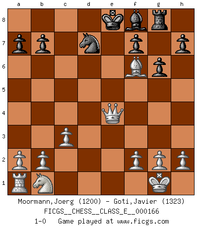 Last move : 1-0 2013 July 31 14:48:16 [Event "FICGS__CHESS__CLASS_E__000166"] [Site "FICGS"] [Date "2013.07.21"] [Round "1"] [White "Moormann,Joerg"] [Black "Goti,Javier"] [Result "1-0"] [WhiteElo "1200"] [BlackElo "1323"] 1.e4 c5 2.d4 cxd4 3.c3 e5 4.Nf3 Nf6 5.Nxe5 Nxe4 6.Bc4 d5 7.Qa4+ Bd7 8.Nxd7 Nxd7 9.Bxd5 Nec5 10.Qxd4 Qe7+ 11.Be3 Nf6 12.O-O Nxd5 13.Qxd5 Rd8 14.Qf3 g6 15.Bd4 Rg8 16.Bf6 Qe4 17.Qxe4+ Ne6 18.Qa4+ Rd7 19.Rd1 Nc5 20.Rxd7 Nxd7 21.Qe4+ 1-0 Sicilian : Smith-Morra gambit Kingside Castling by player White (move 12) Player White won this chess game. Follow this game move after move (download)We must make sure that Chess will not be like a dead language, very interesting, but for a very small group. (Sytze Faber) Frage: Gibt es etwas was Sie mehr lieben als Autobahnen ohne Tempobegrenzungen? - Antwort: Deutsche Frauen ohne Tempobegrenzungen. (Loek van Wely) Las leyes del Ajedrez no permiten una libre elección: tienes que mover quieras o no. (Emanuel Lasker) Plusieurs personnes se sont demandées comment Tal faisait pour gagner... En fait, c'est très simple ! Il met ses pièces au centre de l'échiquier et les sacrifie quelque part ! (David Bronstein) There are lots of people who mistake their imagination for their memory. (Josh Bilings)
