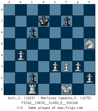 Last move : 1-0 2013 September 24 18:39:41 [Event "FICGS__CHESS__CLASS_E__000166"] [Site "FICGS"] [Date "2013.07.21"] [Round "1"] [White "Goti,Javier"] [Black "Martinez Camacho,Victor Hugo"] [Result "1-0"] [WhiteElo "1323"] [BlackElo "1275"] 1.c4 e5 2.Nc3 Nf6 3.g3 Bc5 4.e3 O-O 5.Bg2 Nc6 6.Nge2 d6 7.O-O Be6 8.Na4 Bb6 9.Nxb6 axb6 10.Qc2 Qd7 11.Re1 Na5 12.b3 Nc6 13.Bb2 Nb4 14.Qb1 c6 15.f3 Ra6 16.a3 Rfa8 17.axb4 Rxa1 18.Bxa1 d5 19.Bxe5 h6 20.Nf4 dxc4 21.Bxf6 gxf6 22.bxc4 Bf5 23.Qb2 b5 24.Qxf6 bxc4 25.Nh5 Kf8 26.Qxh6+ Ke7 27.Qf6+ Kf8 28.Qh8+ Ke7 29.Qxa8 Qxd2 30.Qxb7+ Bd7 31.Kf1 Qd3+ 32.Kg1 Qd2 33.Kf1 c3 34.Bh3 c2 35.Qxd7+ Qxd7 36.Bxd7 Kxd7 37.Rc1 1-0 English : Carls' Bremen system Kingside Castling by player Black (move 4) Kingside Castling by player White (move 7) Player White won this chess game. Follow this game move after move (download)Life is like a game of Chess, changing with each move. (Chinese proverb) Schach ist ein Reich, wo sich die menschliche Phantasie frei entfalten kann. (David Bronstein) El Ajedrez lo es todo: arte, ciencia y deporte. (Anatoly Karpov) Aux échecs, l'amour-propre est satisfait quand on remporte la victoire, mais il n'y a pas de honte à être battu. (Benjamin Franklin) Animated gif is worth one mega-word. (Unknown)