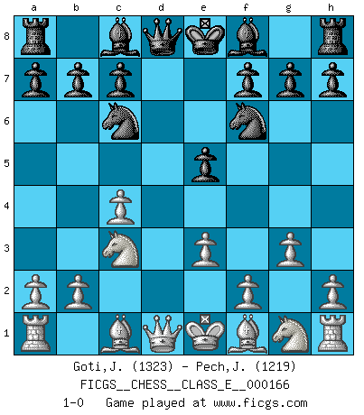 Last move : 1-0 2013 September 4 13:19:5 [Event "FICGS__CHESS__CLASS_E__000166"] [Site "FICGS"] [Date "2013.07.21"] [Round "1"] [White "Goti,Javier"] [Black "Pech,Jaroslav senior"] [Result "1-0"] [WhiteElo "1323"] [BlackElo "1219"] 1.c4 e5 2.Nc3 Nf6 3.e3 Nc6 4.g3 d5 5.d3 dxc4 6.dxc4 1-0 This chess game has been lost on time (started : 2013.07.21 3:58:9) English Opening Player White won this chess game. Follow this game move after move (download)Chess is a beautiful mistress. (Bent Larsen) Ein unbeabsichtigtes Patt ist der Gipfel der Dummheit. (Anonymous) Aquellos que dicen que entienden al Ajedrez, no entienden nada. (Robert Hubner) Si je n'étais pas joueur d'échecs, je serais le meilleur dans quelque chose d'autre. (Anatoli Karpov) I find your interest interesting. (Gregory House, House M.D.)