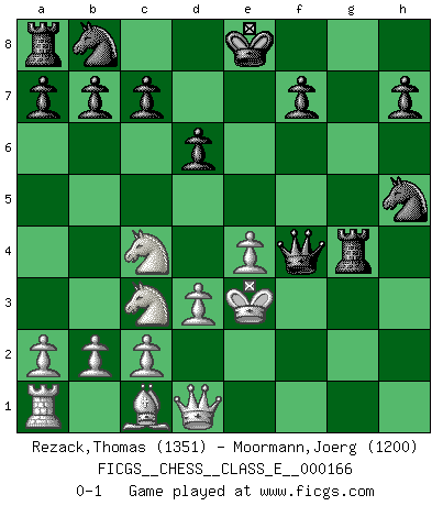 Last move : 0-1 2013 August 27 13:1:31 [Event "FICGS__CHESS__CLASS_E__000166"] [Site "FICGS"] [Date "2013.07.21"] [Round "1"] [White "Rezack,Thomas"] [Black "Moormann,Joerg"] [Result "0-1"] [WhiteElo "1351"] [BlackElo "1200"] 1.e4 e5 2.f4 exf4 3.Nf3 g5 4.h4 g4 5.Ne5 Nf6 6.Nc3 d6 7.Nc4 Be7 8.Be2 f3 9.gxf3 Nh5 10.fxg4 Bxh4+ 11.Rxh4 Qxh4+ 12.Kf1 Rg8 13.Bf3 Bxg4 14.Bxg4 Rxg4 15.d3 Qh1+ 16.Ke2 Qh2+ 17.Ke3 Qf4+ 0-1 KGA : Kieseritsky, Berlin defense Player Black won this chess game. Follow this game move after move (download)A bad day of Chess is better than any good day at work. (Anonymous) Ihnen, Herr Lasker, habe ich nur drei Worte zu sagen: Schach und matt. (Siegbert Tarrasch) El Ajedrez es el arte del análisis. (Mikhail Botvinnik) Les échecs sont utiles à l'exercice de la faculté de penser et à celle de l'imagination. Car nous devons posséder une méthode élaborée pour atteindre des buts partout où nous devons conduire notre raison. (Leibnitz) Nobody is always a winner, and anybody who says he is, is either a liar or doesn't play poker. (Amarillo Slim)