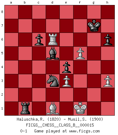Last move : 0-1 2007 December 7 8:27:31 [Event "FICGS__CHESS__CLASS_B__000015"] [Site "FICGS"] [Date "2007.02.05"] [Round "1"] [White "Haluschka,Rainer"] [Black "Musil,Stanislav"] [Result "0-1"] [WhiteElo "1820"] [BlackElo "1900"] 1.d4 Nf6 2.c4 e6 3.Nc3 Bb4 4.e3 O-O 5.Bd3 d5 6.Nf3 Nc6 7.O-O a6 8.Qc2 dxc4 9.Bxc4 Bd6 10.Rd1 Qe8 11.a3 h6 12.b4 e5 13.d5 Ne7 14.h3 b5 15.Bb3 Bd7 16.Bb2 a5 17.Qd3 Ng6 18.Ne4 Nxe4 19.Qxe4 f5 20.Qc2 Kh8 21.Rd2 axb4 22.axb4 Rxa1 23.Bxa1 e4 24.Qc3 Qe7 25.Nd4 Nh4 26.Ra2 Qg5 27.g3 Bxg3 28.Ne6 Bxe6 29.Qxg7+ Qxg7 30.Bxg7+ Kxg7 31.fxg3 Nf3 32.Kf2 Bf7 33.Ra7 Rc8 34.Rb7 Ne5 35.Rxb5 Nd3 36.Kf1 c6 37.Rb7 Kf6 38.Bd1 Bxd5 39.Rh7 Kg6 40.Rd7 Rb8 41.Rd6+ Kg7 42.g4 Rxb4 43.gxf5 Rb1 0-1 This chess game has been lost on time (started : 2007.02.05 8:42:51) Nimzo-Indian : 4.e3 O-O, 5.Bd3 d5 Kingside Castling by player Black (move 4) Kingside Castling by player White (move 7) Player Black won this chess game. Follow this game move after move (download)We cannot resist the fascination of sacrifice, since a passion for sacrifices is part of a Chessplayer's nature. (Rudolf Spielman) Wenn du auf das Glück wartest, wird das Leben ziemlich langweilig. (Mikhail Nekhemyevich Tal) Los finales de Peón son del Ajedrez lo que el cesped es del Golf. (Cecil Purdy) À la honte des hommes, on sait que les lois du jeu sont les seules qui soient partout justes, claires, inviolables et exécutées. Pourquoi l'Indien qui a donné les règles du jeu d'échecs est-il obéi de bon gré dans toute la terre, et que les décrétales des papes, par exemple, sont aujourd'hui un objet d'horreur et de mépris ? C'est que l'inventeur des échecs combina tout avec justesse pour la satisfaction des joueurs, et que les papes, dans leurs décrétales, n'eurent en vue que leur seul avantage. L'Indien voulut exercer également l'esprit des hommes et leur donner du plaisir; les papes ont voulu abrutir l'esprit des hommes. Voltaire (Dictionnaire philosophique / Garnier 1967) In theory there is no difference between theory and practice. In practice there is. (Yogi Berra)