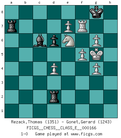 Last move : 1-0 2013 October 19 17:30:42 [Event "FICGS__CHESS__CLASS_E__000166"] [Site "FICGS"] [Date "2013.07.21"] [Round "1"] [White "Rezack,Thomas"] [Black "Gonet,Gerard"] [Result "1-0"] [WhiteElo "1351"] [BlackElo "1243"] 1.e4 e5 2.f4 Nc6 3.Nf3 f5 4.exf5 e4 5.Qe2 Qe7 6.Ng5 d5 7.Nc3 Nf6 8.g4 h6 9.Qb5 a6 10.Qe2 hxg5 11.fxg5 Nh7 12.g6 Qh4+ 13.Qf2 Qxf2+ 14.Kxf2 Ng5 15.Nxd5 Bd6 16.d3 Nf3 17.dxe4 Nfd4 18.Bd3 Bd7 19.Bg5 Ne5 20.h3 Nef3 21.Be7 Rc8 22.Bxd6 cxd6 23.c3 Ne5 24.cxd4 Nxd3+ 25.Ke2 Nxb2 26.Rhb1 Rc2+ 27.Kf3 Rxh3+ 28.Kf4 Rf2+ 29.Kg5 b5 30.e5 Nc4 31.Rg1 Nd2 32.Rge1 Bc6 33.Nc7+ Kd7 34.Nxa6 Ne4+ 35.Rxe4 Bxe4 36.a4 b4 37.e6+ Ke7 38.Nxb4 Rg3 39.a5 Rb3 40.Na6 Rb5 41.Nc7 Rb7 42.Rc1 Rd2 43.a6 Ra7 44.Nb5 Rxa6 45.Rc7+ Kf8 46.Rf7+ Ke8 47.Rxg7 Bc6 48.Nc7+ Kf8 49.Rf7+ Kg8 50.e7 Ra7 51.Ne6 1-0 King's gambit Player White won this chess game. Follow this game move after move (download)Human affairs are like a Chess game: only those who do not take it seriously can be called good players. (Hung Tzu Ch'eng) Matt entspricht nicht immer den Tatsachen. (Savielly Grigorievitsch Tartakower) El tablero es el mundo, las piezas es el fenomeno del universo, las reglas del juego son lo que llamamos leyes de la naturaleza y el jugador del lado opuesto, se encuentra oculto a nuestra vista. (Thomas Huxley) Dieu déplace le joueur, et celui-ci la pièce. Quel Dieu derrière Dieu commence donc la trame ? Arturo Perez-Reverte (prix de littérature policière 1993). What doesn't kill us makes us stronger. (Friedrich Nietzsche)