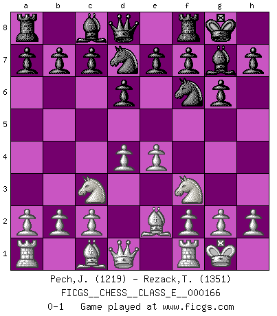 Last move : 0-1 2013 September 10 14:1:50 [Event "FICGS__CHESS__CLASS_E__000166"] [Site "FICGS"] [Date "2013.07.21"] [Round "1"] [White "Pech,Jaroslav senior"] [Black "Rezack,Thomas"] [Result "0-1"] [WhiteElo "1219"] [BlackElo "1351"] 1.e4 d6 2.d4 Nf6 3.Nc3 g6 4.Nf3 Bg7 5.Be2 O-O 6.O-O Nbd7 0-1 Pirc : Classical system, 5.Be2 Kingside Castling by player Black (move 5) Kingside Castling by player White (move 6) Player Black won this chess game. Follow this game move after move (download)One doesn't have to play well, it's enough to play better than your opponent. (Siegbert Tarrasch) Dieses schreckliche Gefühl, dass ich gegen eine Maschine spielte, die niemals Fehler macht, zerschmetterte meinen Widerstand. (Mark Taimanov) El jugador blanco perdió porque fallo en recordar la coreccta continuación y tuvo que pensar por sí mismo las movidas. (Siegbert Tarrasch) Le thème de l'attaque double intervient d'une manière ou d'une autre dans l'immense majorité des combinaisons. (Youri Averbakh) A proverb is a short sentence based on long experience. (Miguel de Cervantes)