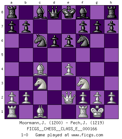 Last move : 1-0 2013 September 2 1:8:57 [Event "FICGS__CHESS__CLASS_E__000166"] [Site "FICGS"] [Date "2013.07.21"] [Round "1"] [White "Moormann,Joerg"] [Black "Pech,Jaroslav senior"] [Result "1-0"] [WhiteElo "1200"] [BlackElo "1219"] 1.e4 c5 2.d4 cxd4 3.c3 dxc3 4.Nxc3 Nc6 5.Nf3 d6 6.Bc4 e6 7.O-O Nf6 8.Qe2 1-0 This chess game has been lost on time (started : 2013.07.21 3:58:9) Sicilian : Smith-Morra gambit Kingside Castling by player White (move 7) Player White won this chess game. Follow this game move after move (download)Best by test: 1. e4 (Bobby Fischer) Dein Körper muss in Topform sein. Dein Schach verfällt, wenn dein Körper verfällt. Der Körper kann nicht vom Geist getrennt werden. (Robert James Fischer) Botvinnik trató de alejar el misterio referente al Ajedrez, siempre relacionandolo a situaciones de la vida diaria. Solía llamar al Ajedrez un problema inexacto típico, similar a aquellos en que la gente tiene siempre que resolver a cada día. (Garry Kasparov) Les Echecs sont affaire de jugement sensible. Savoir quand frapper et quand esquiver. (Fischer) A clear conscience is usually the sign of a bad memory. (Unknown)