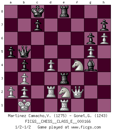 Last move : 1/2-1/2 2013 September 20 18:53:24 [Event "FICGS__CHESS__CLASS_E__000166"] [Site "FICGS"] [Date "2013.07.21"] [Round "1"] [White "Martinez Camacho,Victor Hugo"] [Black "Gonet,Gerard"] [Result "1/2-1/2"] [WhiteElo "1275"] [BlackElo "1243"] 1.e4 e5 2.Nf3 f5 3.Nxe5 Qf6 4.d4 d6 5.Nf3 fxe4 6.Ng1 Ne7 7.Nc3 d5 8.Be2 Bf5 9.Be3 Nbc6 10.Qd2 O-O-O 11.O-O-O Be6 12.f3 Nf5 13.Bg5 e3 14.Bxe3 Nxe3 15.Qxe3 Bd6 16.Bb5 Na5 17.Nge2 a6 18.Ba4 Nc4 19.Qg1 b5 20.Bb3 Bf4+ 21.Kb1 Nd2+ 22.Ka1 Rhe8 23.g3 Nxb3+ 24.cxb3 Bh6 25.f4 Bg4 26.Rd2 Rd6 27.h3 Bh5 28.Qg2 Rde6 29.Re1 Re3 30.g4 Bg6 31.g5 Bxg5 32.fxg5 Qe6 33.h4 b4 34.Nxd5 Be4 35.Ndf4 Qd7 36.Qh2 Bf5 37.Qf2 Qb5 38.h5 Bg4 39.h6 g6 40.Kb1 a5 1/2-1/2 Latvian counter-gambit Queenside Castling by player Black (move 10) Queenside Castling by player White (move 11) This chess game ended in a draw. Follow this game move after move (download)Chess is the art of analysis. (Mikhail Botvinnik) Es genügt nicht ein guter Spieler zu sein, man muß auch gut spielen. (Siegbert Tarrasch) En la vida, como en el Ajedrez, los Peones propios obstruyen nuestro camino. La gran fortuna de un hombre, su comodidad, placer, hijos, libros, que deberían ayudarle a ganar, con mucha frecuencia lo ponen en Jaque Mate. (Charles Buxton) Les échecs, c'est la lutte contre l'erreur. (Johannes Zukertort) Life is like a game of cards: the hand you are dealt represents determinism; the way you play it is free will. (Jawaharlal Nehru)