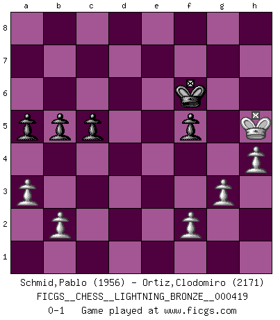Last move : 0-1 2013 July 21 13:20:8 [Event "FICGS__CHESS__LIGHTNING_BRONZE__000419"] [Site "FICGS"] [Date "2013.07.21"] [Round "1"] [White "Schmid,Pablo"] [Black "Ortiz,Clodomiro"] [Result "0-1"] [WhiteElo "1956"] [BlackElo "2171"] 1.Nf3 d5 2.d4 Nf6 3.c4 e6 4.g3 Bb4+ 5.Bd2 a5 6.Bg2 dxc4 7.O-O O-O 8.Bg5 Nc6 9.e3 Be7 10.Nbd2 e5 11.dxe5 Ng4 12.Bxe7 Qxe7 13.Nxc4 Ncxe5 14.Ncxe5 Nxe5 15.Nxe5 Qxe5 16.Qd4 Qe7 17.Rfd1 c6 18.a3 Be6 19.Qe5 Rfe8 20.Rd4 Bb3 21.Qxe7 Rxe7 22.Rc1 R7e8 23.Rc3 Be6 24.Rc5 g6 25.Bf3 h5 26.h4 Ra7 27.Kg2 Kg7 28.Rg5 Rh8 29.Rc5 Ra6 30.Be2 R6a8 31.Bf3 Rhb8 32.Kf1 Ra7 33.Ke1 Kf6 34.Be2 Rc8 35.Rf4+ Ke7 36.Bc4 Rd8 37.Bxe6 Kxe6 38.Re4+ Kd6 39.Rc2 Kc7 40.Rf4 f5 41.e4 fxe4 42.Rxe4 R7a8 43.Rd2 Re8 44.Rde2 Rxe4 45.Rxe4 Kd7 46.Ke2 Rf8 47.Re5 Rf5 48.Rxf5 gxf5 49.Ke3 Ke6 50.Kf4 b5 51.Kg5 c5 52.Kxh5 Kf6 0-1 Reti Opening Kingside Castling by player White (move 7) Kingside Castling by player Black (move 7) Player Black won this chess game. Follow this game move after move (download)Discovered check is the dive bomber of the Chessboard. (Reuben Fine) Ich habe die besten Aussichten, den ersten Preis zu gewinnen - denn jeder muss gegen Steinitz spielen, nur ich nicht! (Wilhelm Steinitz) Debemos de asegurarnos de que el Ajedrez no se convierta en un lenguaje muerto, muy interesante, pero solo para un grupo muy pequeño. (Sytze Faber) Toutes choses étant égales, c'est la conviction qui gagne. Alliée à une volonté de vaincre, elle sert de détonateur, suscite des idées, disperse les doutes et aide à penser clairement. (Robert Fischer) You must do what you feel is right... of course. (Obi-Wan Kenobi in Star Wars ep.4)