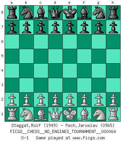 Last move : 0-1 2013 September 14 13:53:32 [Event "FICGS__CHESS__NO_ENGINES_TOURNAMENT__000064"] [Site "FICGS"] [Date "2013.07.21"] [Round "1"] [White "Staggat,Rolf"] [Black "Pech,Jaroslav"] [Result "0-1"] [WhiteElo "1949"] [BlackElo "0965"] 0-1 This chess game has been lost on time (started : 2013.07.21 12:45:33) Player Black won this chess game. Follow this game move after move (download)Adequate compensation for a sacrifice is having a sound combination leading to a winning position; adequate compensation for a blunder is having your opponent snatch defeat from the jaws of victory. (Bruce A. Moon) Es liegt in der Natur, vernüftig zu denken und unlogisch zu handeln. (Anatole France) El Ajedrez es parte de una cultura y si una cultura esta en decadencia, entonces también el Ajedrez declinará. (Mikhail Botvinnik) Dieu déplace le joueur, et celui-ci la pièce. Quel Dieu derrière Dieu commence donc la trame ? Arturo Perez-Reverte (prix de littérature policière 1993). Players are not good because they find tactics, it is about the way to find the positions in which those tactics are hidden. (Luc-Olivier Leclerc)