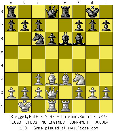 Last move : 1-0 2013 October 18 16:29:26 [Event "FICGS__CHESS__NO_ENGINES_TOURNAMENT__000064"] [Site "FICGS"] [Date "2013.07.21"] [Round "1"] [White "Staggat,Rolf"] [Black "Kalapos,Karol"] [Result "1-0"] [WhiteElo "1949"] [BlackElo "1722"] 1.e4 e5 2.Nf3 Nf6 3.Nxe5 d6 4.Nf3 Nxe4 5.Nc3 Nxc3 6.dxc3 Be7 7.Be3 O-O 8.Qd2 Re8 9.O-O-O Be6 10.Kb1 Nc6 11.Bd3 Bf6 12.Rhe1 1-0 Petrov : Nimzovich attack Kingside Castling by player Black (move 7) Queenside Castling by player White (move 9) Player White won this chess game. Follow this game move after move (download)It began to feel as though you were playing against Chess itself. - On playing against Robert Fischer. (Walter Shipman) Ein typischer, sehr verbreiteter Gedankenschädling ist der, daß der betreffende Amateur von der Annanhme ausgeht, daß jeder einzelne Zug etwas zu leisten habe. (Aaron Nimzowitsch) El hombre es un frívolo, una creatura engañosa y como un jugador de Ajedrez, se preocupa mas por el proceso de obtener su meta que de la meta por sí misma. (Dostoyevsky) Des idées, des idées, j'en ai cent, j'en ai mille. Des bonnes, des mauvaises, applicables, irréalisables... Il suffit de faire le tri ! (Roos) The right perception of any matter and a misunderstanding of the same matter do not wholly exclude each other. (Kafka's the trial)