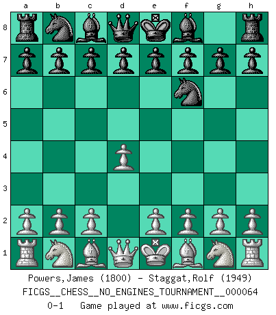 Last move : 0-1 2013 September 3 1:14:5 [Event "FICGS__CHESS__NO_ENGINES_TOURNAMENT__000064"] [Site "FICGS"] [Date "2013.07.21"] [Round "1"] [White "Powers,James"] [Black "Staggat,Rolf"] [Result "0-1"] [WhiteElo "1800"] [BlackElo "1949"] 1.d4 Nf6 0-1 This chess game has been lost on time (started : 2013.07.21 12:45:33) Queen's pawn game Player Black won this chess game. Follow this game move after move (download)The most important feature of the Chess position is the activity of the pieces. This is absolutely fundamental in all phases of the game: Opening, Middlegame and especially Endgame. The primary constraint on a piece's activity is the Pawn structure. (Michael Stean) Der vorletzte Fehler gewinnt. (Savielly Grigorievitsch Tartakower) El estómago es una parte esencial del maestro de Ajedrez. (Bent Larsen) Ce qui est bien, c'est d'avoir tout un tas de pièces en prise : l'adversaire ne peut en prendre qu'une à la fois. Cité par Thierry Audin. Computers make it easier to do a lot of things, but most of the things they make it easier to do don't need to be done. (Andy Rooney)