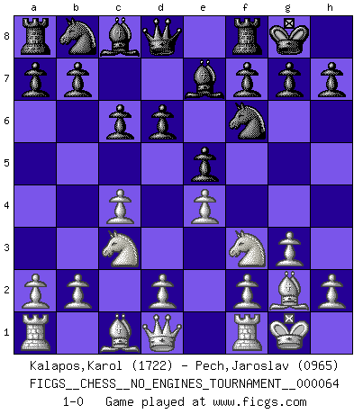 Last move : 1-0 2013 September 5 1:53:27 [Event "FICGS__CHESS__NO_ENGINES_TOURNAMENT__000064"] [Site "FICGS"] [Date "2013.07.21"] [Round "1"] [White "Kalapos,Karol"] [Black "Pech,Jaroslav"] [Result "1-0"] [WhiteElo "1722"] [BlackElo "0965"] 1.c4 e5 2.g3 d6 3.Nc3 Nf6 4.Bg2 Be7 5.Nf3 c6 6.O-O O-O 7.e4 1-0 English Opening Kingside Castling by player White (move 6) Kingside Castling by player Black (move 6) Player White won this chess game. Follow this game move after move (download)Chess, like love, like music, has the power to make people happy. (Siegbert Tarrasch) Die Leute spielen gegen mich seit 15 Jahren unter Ihren Möglichkeiten. (Robert James Fischer) La última cosa en que Fischer estaba interesado era en tonterías, siempre y cuando el Ajedrez estuviera involucrado. (Elie Agur) Les échecs, c'est l'art d'analyser. (Mikhail Botvinnik) Live, lose, and learn, by observing your opponent how to win. (Amber Steenbock)
