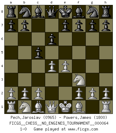 Last move : 1-0 2013 September 3 13:15:43 [Event "FICGS__CHESS__NO_ENGINES_TOURNAMENT__000064"] [Site "FICGS"] [Date "2013.07.21"] [Round "1"] [White "Pech,Jaroslav"] [Black "Powers,James"] [Result "1-0"] [WhiteElo "0965"] [BlackElo "1800"] 1.e4 c5 2.Nf3 d6 3.d4 1-0 This chess game has been lost on time (started : 2013.07.21 12:45:33) Sicilian Player White won this chess game. Follow this game move after move (download)Chess is as much a mystery as women. (Purdy) Im Wettkampf zwischen starken Meistern kommen Fehler sehr selten vor, deshalb ist es mit bloßem Warten nicht getan. (José Raúl Capablanca) Tu sabes que vas a perder. Aún cuando tenía la ventaja, yo sabía que iba a perder. - al estar jugando con Fischer (Andrew Soltis) Les échecs sont un jeu par leur forme, un art par leur essence et une science par sa difficulté d'acquisition. Ils peuvent vous procurer autant de plaisir qu'un bon livre ou une belle musique, mais vous n'aurez une réelle joie que si vous arrivez à bien jouer. (Tigran Petrosian) Wikichess, chess moves explained by 'experimented' players. (Thibault de Vassal)