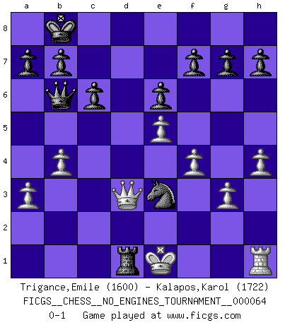 Last move : 0-1 2013 August 5 20:8:54 [Event "FICGS__CHESS__NO_ENGINES_TOURNAMENT__000064"] [Site "FICGS"] [Date "2013.07.21"] [Round "1"] [White "Trigance,Emile"] [Black "Kalapos,Karol"] [Result "0-1"] [WhiteElo "1600"] [BlackElo "1722"] 1.e4 Nf6 2.e5 Nd5 3.d4 c6 4.c4 Nc7 5.f4 d5 6.Nf3 Bg4 7.h3 Bxf3 8.Qxf3 e6 9.Bd3 dxc4 10.Bxc4 Qxd4 11.Be2 Nba6 12.a3 O-O-O 13.Nc3 Bc5 14.Rb1 Bb6 15.b4 Kb8 16.Na4 Nd5 17.Nxb6 Qxb6 18.Rb3 Nac7 19.Be3 Nxe3 20.Qxe3 Rd4 21.Rd3 Rhd8 22.Rxd4 Rxd4 23.Qf3 Nd5 24.g3 Ne3 25.h4 Nc2+ 26.Kf1 Rd2 27.Qc3 Ne3+ 28.Ke1 Rc2 29.Qd3 Rc1+ 30.Bd1 Rxd1+ 0-1 Alekhine's defense Queenside Castling by player Black (move 12) Player Black won this chess game. Follow this game move after move (download)Life is a kind of Chess, with struggle, competition, good and ill events. (Benjamin Franklin) Ein unbeabsichtigtes Patt ist der Gipfel der Dummheit. (Anonymous) Botvinnik trataba de restarle el misterio al Ajedrez, siempre relacionandolo a situaciones de la vida ordinaria. El gustaba de llamar al Ajedrez un típico problema inexacto similar a aquellos de los cuales la gente siempre tiene que enfrentarse en la vida cotidiana. (Garry Kasparov) Les sacrifices démontrent seulement que quelqu'un a gaffé. (Savielly Tartacover) Fame, I have already. Now I need the money. (an elderly Steinitz)