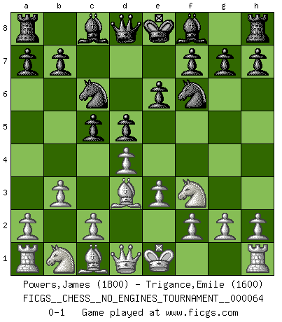 Last move : 0-1 2013 September 1 13:6:43 [Event "FICGS__CHESS__NO_ENGINES_TOURNAMENT__000064"] [Site "FICGS"] [Date "2013.07.21"] [Round "1"] [White "Powers,James"] [Black "Trigance,Emile"] [Result "0-1"] [WhiteElo "1800"] [BlackElo "1600"] 1.d4 e6 2.Nf3 d5 3.e3 c5 4.b3 Nf6 5.Bd3 Nc6 0-1 This chess game has been lost on time (started : 2013.07.21 12:45:33) Queen's pawn Player Black won this chess game. Follow this game move after move (download)Up to this point White has been following well-known analysis. But now he makes a fatal error: he begins to use his own head. (Siegbert Tarrasch) Ihnen, Herr Lasker, habe ich nur drei Worte zu sagen: Schach und matt. (Siegbert Tarrasch) Un mal día en el Ajedrez, es mejor que cualquier buen día en el trabajo. (Anonymous) On n'a jamais que l'âge auquel on a commence à jouer aux échecs car après on cesse de vieillir. (Capablanca) I think your argument is specious - I think your tie is ugly. (Gregory House to Dr. Foreman, House M.D.)