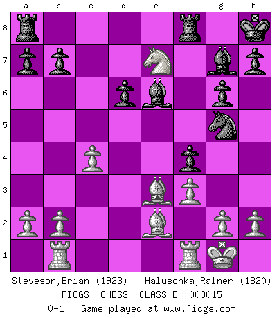 Last move : 0-1 2007 June 1 11:46:4 [Event "FICGS__CHESS__CLASS_B__000015"] [Site "FICGS"] [Date "2007.02.05"] [Round "1"] [White "Steveson,Brian"] [Black "Haluschka,Rainer"] [Result "0-1"] [WhiteElo "1923"] [BlackElo "1820"] 1.e4 c5 2.Nf3 Nc6 3.d4 cxd4 4.Nxd4 d6 5.c4 Nf6 6.Nc3 Nxd4 7.Qxd4 g6 8.Be2 Bg7 9.Be3 Be6 10.O-O O-O 11.Qd2 Qa5 12.Nd5 Qxd2 13.Bxd2 Nxe4 14.Nxe7+ Kh8 15.Be3 f5 16.Rab1 f4 17.f3 Ng5 0-1 Sicilian defense Kingside Castling by player White (move 10) Kingside Castling by player Black (move 10) Player Black won this chess game. Follow this game move after move (download)Pawn endings are to Chess what putting is to golf. (Cecil Purdy) Fischer: 'Remis!?' Uhlmann: 'Aber es muss doch dreimal Zugwiederholung sein!' Fischer: 'Sie nehmen das Remis an, wie ich es sage, sonst spiele ich weiter und werde Sie dann schlagen!' (Robert James Fischer) Uno por uno, yo los acribillé, mi superioridad muy pronto se volvio aparente. (Jose Capablanca) Mais l'homme est une créature légère et illogique : semblable au joueur d'échecs, il n'aime que le processus du but à atteindre, non le but lui-même. (Dostoïevsky) Hold em is to stud what chess is to checkers. (Johnny Moss)