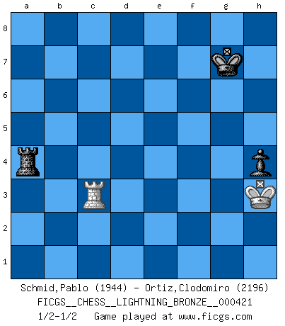 Last move : 1/2-1/2 2013 July 21 17:23:34 [Event "FICGS__CHESS__LIGHTNING_BRONZE__000421"] [Site "FICGS"] [Date "2013.07.21"] [Round "1"] [White "Schmid,Pablo"] [Black "Ortiz,Clodomiro"] [Result "1/2-1/2"] [WhiteElo "1944"] [BlackElo "2196"] 1.e4 e5 2.Nf3 Nc6 3.Bc4 Nf6 4.d4 exd4 5.e5 d5 6.Bb5 Ne4 7.Nxd4 Bd7 8.Bxc6 bxc6 9.O-O Bc5 10.f3 Ng5 11.f4 Ne4 12.Be3 Qb8 13.Nc3 Qxb2 14.Nxe4 dxe4 15.Qd2 Rd8 16.Rfb1 Qa3 17.Rb3 Qa6 18.Qc3 Be7 19.R3b1 O-O 20.Nb3 Be6 21.Nc5 Bxc5 22.Qxc5 Ra8 23.a4 Rfd8 24.h3 h6 25.Kf2 Rd7 26.Qb4 Rad8 27.Qxe4 c5 28.f5 Rd2+ 29.Bxd2 Rxd2+ 30.Ke1 Bd5 31.Qe3 Rxg2 32.f6 Qc4 33.Ra3 Qh4+ 34.Kd1 gxf6 35.Kc1 Kh7 36.exf6 c4 37.Rb5 c6 38.Rb8 Qxf6 39.Re8 a6 40.Qc3 Qxc3 41.Rxc3 f5 42.Ra8 f4 43.Kd1 f3 44.Ke1 h5 45.Rxa6 Rh2 46.a5 Rxh3 47.Kf2 Rh2+ 48.Kf1 h4 49.Ra7+ Kh6 50.Ra8 Rh1+ 51.Kf2 Kg7 52.Rxf3 Rh2+ 53.Kg1 Rxc2 54.Rf2 Rc3 55.Kh2 Rc1 56.Kh3 c3 57.Re8 c2 58.Rh2 Bb3 59.R8e2 Ra1 60.Rxc2 Bxc2 61.Rxc2 Rxa5 62.Rxc6 Ra4 63.Rc3 1/2-1/2 Two knights defense Kingside Castling by player White (move 9) Kingside Castling by player Black (move 19) 10 pieces endgame at move 53 : White KRRP , Black KRBPPP WHITE : King + 2 Rooks 1 Pawn BLACK : King + 1 Rook 1 Bishop 3 Pawns 9 pieces endgame at move 60 : White KRRP , Black KRBPP WHITE : King + 2 Rooks 1 Pawn BLACK : King + 1 Rook 1 Bishop 2 Pawns 8 pieces endgame at move 60 : White KRP , Black KRBPP WHITE : King + 1 Rook 1 Pawn BLACK : King + 1 Rook 1 Bishop 2 Pawns 7 pieces endgame at move 61 : White KRP , Black KRPP WHITE : King + 1 Rook 1 Pawn BLACK : King + 1 Rook 2 Pawns 6 pieces endgame at move 61 : White KR , Black KRPP WHITE : King + 1 Rook BLACK : King + 1 Rook 2 Pawns 5 pieces endgame at move 62 : White KR , Black KRP WHITE : King + 1 Rook BLACK : King + 1 Rook 1 Pawn This chess game ended in a draw. Follow this game move after move (download)Chess is 99 percent tactics. (Teichmann) Ein Gewinn durch eine ungenaue Kombination, sei sie auch noch so vorzeigbar, erfüllt mich mit Schaudern. (Wilhelm Steinitz) Evita las multitudes. Haz independientemente tu propio razonamiento. Trata de ser el jugador de Ajedrez, no la pieza de Ajedrez. (Ralph Charell) Le jeu d'échecs fait naître et fortifie en nous plusieurs qualités précieuses dans le cours de l'existence, telles que la prévoyance, la circonspection, la prudence, et la persévérance. (Benjamin Franklin - 1783, la morale des échecs) You have to believe in yourself. (Sun Tzu)