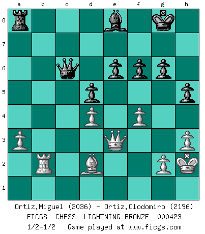 Last move : 1/2-1/2 2013 July 22 0:6:51 [Event "FICGS__CHESS__LIGHTNING_BRONZE__000423"] [Site "FICGS"] [Date "2013.07.21"] [Round "1"] [White "Ortiz,Miguel"] [Black "Ortiz,Clodomiro"] [Result "1/2-1/2"] [WhiteElo "2036"] [BlackElo "2196"] 1.e4 e6 2.d4 d5 3.e5 c5 4.c3 Nc6 5.Nf3 Qb6 6.a3 Nh6 7.b4 cxd4 8.cxd4 Nf5 9.Bb2 Be7 10.Bd3 O-O 11.O-O a6 12.Qd2 h6 13.Rc1 Rd8 14.h3 Nh4 15.Nxh4 Bxh4 16.Qe3 Bd7 17.Nd2 Na7 18.Bc2 Rdc8 19.Qd3 g6 20.Nb3 Be8 21.Qe3 Bg5 22.f4 Be7 23.Rab1 Rc4 24.Qg3 Kh7 25.Nc5 a5 26.Bd3 Rxc1+ 27.Bxc1 Nc6 28.bxa5 Qxa5 29.Nxb7 Qc7 30.Qe3 Kg8 31.Kh2 Bf8 32.Kh1 h5 33.Kh2 Ra4 34.Nd6 Bxd6 35.exd6 Qxd6 36.Bb5 Ra8 37.Bxc6 Qxc6 38.Rb2 f6 39.Bd2 1/2-1/2 French : Advance, Paulsen attack Kingside Castling by player Black (move 10) Kingside Castling by player White (move 11) This chess game ended in a draw. Follow this game move after move (download)White lost because he failed to remember the right continuation and had to think up the moves himself. (Siegbert Tarrasch) Spiel ein langweiliges Spiel zu Ende und lustige Dinge können passieren. (Hans Ree) Un buen sacrificio es aquel que aunque no sea necesariamente sólido, deja a tu oponente aturdido y confuso. (Rudolph Spielmann) Même si vous avez un bon coup à faire, regardez toujours s'il n'y en a pas un qui lui soit préférable. (Pedro Damiano) 'preceded by its own quotation yields a falsehood' preceded by its own quotation yields a falsehood. (W. V. O. Quine - Set Theory And Its Logic, 1953)