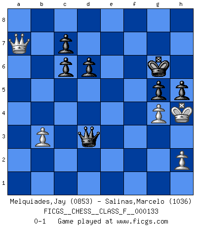 Last move : 0-1 2013 November 5 20:24:20 [Event "FICGS__CHESS__CLASS_F__000133"] [Site "FICGS"] [Date "2013.07.22"] [Round "1"] [White "Melquiades,Jay"] [Black "Salinas,Marcelo"] [Result "0-1"] [WhiteElo "0853"] [BlackElo "1036"] 1.e4 e5 2.Nf3 Nc6 3.c3 Nf6 4.d3 Ng4 5.Bg5 Be7 6.Bxe7 Qxe7 7.Nbd2 Qc5 8.d4 exd4 9.Ng5 Qxg5 10.Nf3 Qg6 11.b4 a6 12.Nxd4 d6 13.b5 axb5 14.Nf5 Bxf5 15.exf5 Qxf5 16.f3 Ne3 17.Qc1 Nc2+ 18.Kf2 Qc5+ 19.Kg3 Qxc3 20.Rb1 Qe5+ 21.f4 Qf5 22.Bxb5 O-O 23.Bxc6 bxc6 24.Rb7 Ra3+ 25.Rb3 Qg6+ 26.Kf2 Rxb3 27.axb3 Ra8 28.Qd2 Ra1 29.Rxa1 Nxa1 30.Qa5 Qc2+ 31.Kg3 Qd3+ 32.Kg4 g6 33.Qa8+ Kg7 34.Qxa1+ f6 35.Qa7 h5+ 36.Kh4 g5+ 37.fxg5 Kg6 38.g4 fxg5+ 0-1 Ponziani : Jaenisch counter-attack Kingside Castling by player Black (move 22) Player Black won this chess game. Follow this game move after move (download)A chess genius has died; a loss for humanity. (Viktor Kortchnoi, about Bobby Fischer's death) Er war ein guter Schachspieler, aber ich kann Leute nicht ausstehen, die 'Heil Hitler' rufen (Über Alexander Aljechin). (Miguel Najdorf) No soy una persona materialista y por eso, no resiento la falta o pérdida del dinero. La ausencia de cosas mundanas carece de importancia. Ya que el Ajedrez es una forma en la que puedo ser tan materialista como yo desee sin tener la necesidad de vender mi alma. (Jamie Walter Adams) Les échecs sont utiles à l'exercice de la faculté de penser et à celle de l'imagination. Car nous devons posséder une méthode élaborée pour atteindre des buts partout où nous devons conduire notre raison. (Leibnitz) It's not enough to succeed. Others must fail. (Gore Vidal)