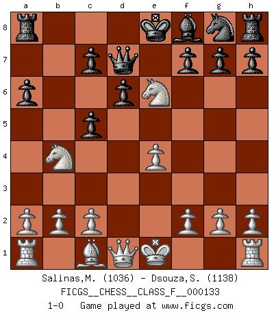 Last move : 1-0 2013 September 15 1:53:7 [Event "FICGS__CHESS__CLASS_F__000133"] [Site "FICGS"] [Date "2013.07.22"] [Round "1"] [White "Salinas,Marcelo"] [Black "Dsouza,Stanislaus"] [Result "1-0"] [WhiteElo "1036"] [BlackElo "1138"] 1.e4 e5 2.Nc3 Nc6 3.Nf3 d6 4.Nd5 Be6 5.Bb5 a6 6.Bxc6+ bxc6 7.Nb4 Qd7 8.d4 exd4 9.Nxd4 c5 10.Nxe6 1-0 This chess game has been lost on time (started : 2013.07.22 10:1:1) Vienna game, Max Lange defense Player White won this chess game. Follow this game move after move (download)Every Pawn is a potential Queen. (James Mason) Schon mancher Spieler hat aufgegeben, um zu vermeiden, daß er eine Figur verliert. (Savielly Grigorievitsch Tartakower) Con el fin de mejorar tu juego, debes de estudiar los finales antes que todo, ya que mientras que los finales pueden ser estudiados y dominados por sí mismos, el juegomedio y la apertura deben de ser estudiados en relación con los finales. (José Raúl Capablanca) 'L'échange des dames est un coup dur pour les deux adversaires...' Un journaliste lors d'une partie du match Spassky-Fischer Indecision is the key to flexibility. (Unknown)