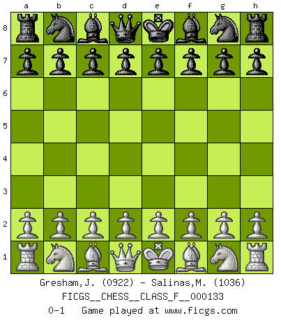 Last move : 0-1 2013 August 31 12:59:46 [Event "FICGS__CHESS__CLASS_F__000133"] [Site "FICGS"] [Date "2013.07.22"] [Round "1"] [White "Gresham,Jonathan"] [Black "Salinas,Marcelo"] [Result "0-1"] [WhiteElo "0922"] [BlackElo "1036"] 0-1 This chess game has been lost on time (started : 2013.07.22 10:1:1) Player Black won this chess game. Follow this game move after move (download)A man without frontiers. He didn't divide the East and the West, he brought them together in their admiration for him. (Ljubomir Ljubojevic, about Bobby Fischer's death) Ich organisiere ein großes Turnier, was mich etwa 120000 Dollar kostet. Ich denke, das ist das erste Mal in der Schachgeschichte, daß ein Schachgroßmeister auch als Mäzen auftritt. (Miguel Najdorf) El Ajedrez te enseña a controlarl la excitación inicial que sientes cuando vez algo que parece bueno y te enseña a pensar objetivamente cuando te encuentras en problemas. (Stanley Kubrick) Les échecs, c'est l'art d'analyser. (Mikhail Botvinnik) The difference between stupidity and genius is that genius has its limits. (Murphy)