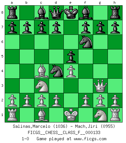 Last move : 1-0 2013 September 5 1:55:32 [Event "FICGS__CHESS__CLASS_F__000133"] [Site "FICGS"] [Date "2013.07.22"] [Round "1"] [White "Salinas,Marcelo"] [Black "Mach,Jiri"] [Result "1-0"] [WhiteElo "1036"] [BlackElo "0955"] 1.Nc3 Nc6 2.e4 e5 3.Qf3 Nf6 4.Bc4 Nd4 5.Qg3 1-0 Dunst (Sleipner, Heinrichsen) Opening Player White won this chess game. Follow this game move after move (download)There is no remorse like the remorse of Chess. (H. G. Wells) Ich verstehe Aljechins Kombinationen ganz gut; aber woher er diese Angriffschancen bekommt und wie er die Eröffnung behandelt das ist für mich ein Buch mit sieben Siegeln. (Rudolf Spielmann) No solamente yo pronostico su triunfo sobre Botvinnik, sino que me adelanto y digo que probablemente Fischer es el jugador de Ajedrez mas grande que haya existido. (John Collins) À la honte des hommes, on sait que les lois du jeu sont les seules qui soient partout justes, claires, inviolables et exécutées. Pourquoi l'Indien qui a donné les règles du jeu d'échecs est-il obéi de bon gré dans toute la terre, et que les décrétales des papes, par exemple, sont aujourd'hui un objet d'horreur et de mépris ? C'est que l'inventeur des échecs combina tout avec justesse pour la satisfaction des joueurs, et que les papes, dans leurs décrétales, n'eurent en vue que leur seul avantage. L'Indien voulut exercer également l'esprit des hommes et leur donner du plaisir; les papes ont voulu abrutir l'esprit des hommes. Voltaire (Dictionnaire philosophique / Garnier 1967) If we don't succeed, we run the risk of failure. (George W. Bush)