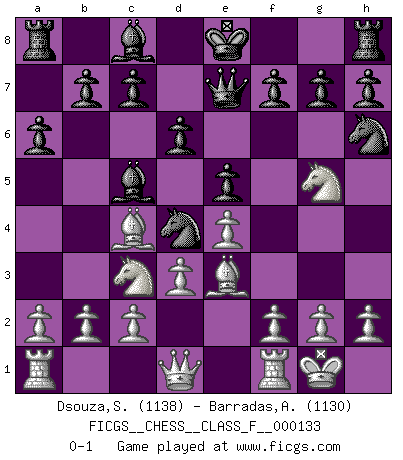 Last move : 0-1 2013 September 1 13:6:43 [Event "FICGS__CHESS__CLASS_F__000133"] [Site "FICGS"] [Date "2013.07.22"] [Round "1"] [White "Dsouza,Stanislaus"] [Black "Barradas,Anderson"] [Result "0-1"] [WhiteElo "1138"] [BlackElo "1130"] 1.e4 e5 2.Nf3 Nc6 3.Bc4 Bc5 4.d3 d6 5.O-O Qe7 6.Ng5 Nh6 7.Nc3 Nd4 8.Be3 a6 0-1 This chess game has been lost on time (started : 2013.07.22 10:1:1) Giuoco Pianissimo Kingside Castling by player White (move 5) Player Black won this chess game. Follow this game move after move (download)I like the moment when I break a man's ego. (Bobby Fischer) Der Partner hat auch seine Existenzberechtigung. (Savielly Grigorievitsch Tartakower) El Ajedrez expande y enriquece tu mente. (Saudin Robovic) Avec des compensations pour le matériel en plus... (Anonyme) Ah, beer! The cause of, and the solution to, all of life's problems. (Homer Simpson)