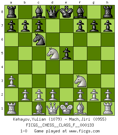 Last move : 1-0 2013 September 4 1:17:12 [Event "FICGS__CHESS__CLASS_F__000133"] [Site "FICGS"] [Date "2013.07.22"] [Round "1"] [White "Kehayov,Yulian"] [Black "Mach,Jiri"] [Result "1-0"] [WhiteElo "1079"] [BlackElo "0955"] 1.e4 e5 2.Nf3 Nc6 3.a3 Nf6 4.Nc3 d5 5.exd5 Nxd5 6.Nxd5 1-0 This chess game has been lost on time (started : 2013.07.22 10:1:1) King's pawn game Player White won this chess game. Follow this game move after move (download)Robert Fischer is a law unto himself. (Larry Evans) Im Hotelzimmer gab es nur zwei Schaben. (Über die Turnierbedingungen) (Peter Swidler) Una buena memoria, concentración, imaginación y una fuerte voluntad, se requiere para llegar a ser un buen jugador. (Bobby Fischer) Nous vivons dans un monde échiquéen : chaque jour qui passe est un défi à relever. (Philosophe Sasha) Tomorrow's what you make of it. (Horatio Caine, C.S.I. Miami)