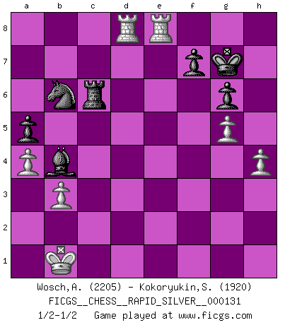 Last move : 1/2-1/2 2013 November 3 6:27:25 [Event "FICGS__CHESS__RAPID_SILVER__000131"] [Site "FICGS"] [Date "2013.07.22"] [Round "2"] [White "Wosch,Arkadiusz"] [Black "Kokoryukin,Sergey"] [Result "1/2-1/2"] [WhiteElo "2205"] [BlackElo "1920"] 1.e4 c5 2.Nf3 d6 3.d4 cxd4 4.Nxd4 Nf6 5.Nc3 a6 6.Be3 e6 7.f3 b5 8.Qd2 Nbd7 9.g4 b4 10.Nce2 h6 11.O-O-O Qc7 12.h4 d5 13.Bg2 Nb6 14.b3 dxe4 15.Bf4 e3 16.Qd3 e5 17.Bxe5 Qxe5 18.f4 Qc5 19.Bxa8 Nxa8 20.Nc6 Bd7 21.Ne5 Nb6 22.Nxd7 Nfxd7 23.Rh3 Be7 24.Rxe3 O-O 25.g5 Rc8 26.Qe4 Bf8 27.Kb1 Qc6 28.c4 bxc3 29.Nxc3 g6 30.Qxc6 Rxc6 31.a4 a5 32.Nd5 Kg7 33.Nxb6 Nxb6 34.Rd8 hxg5 35.fxg5 Bb4 36.R3e8 1/2-1/2 Sicilian : Najdorf, Byrne (English) attack Queenside Castling by player White (move 11) Kingside Castling by player Black (move 24) This chess game ended in a draw. Follow this game move after move (download)Nonsense was the last thing Fischer was interested in, as far as Chess was concerned. (Elie Agur) Schach ist Leben. (Robert James Fischer) Bobby solo arroja las piezas y solas caen en las casillas correctas. (Miguel Najdorf ) Vouloir jouer aux échecs contre soi-même est aussi paradoxal que vouloir marcher sur son ombre. (Stefan Zweig) Empty your mind, be formless, shapeless — like water. (Bruce Lee)