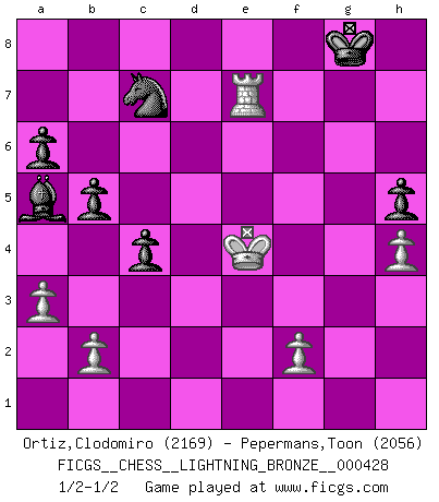 Last move : 1/2-1/2 2013 July 24 17:39:39 [Event "FICGS__CHESS__LIGHTNING_BRONZE__000428"] [Site "FICGS"] [Date "2013.07.24"] [Round "1"] [White "Ortiz,Clodomiro"] [Black "Pepermans,Toon"] [Result "1/2-1/2"] [WhiteElo "2169"] [BlackElo "2056"] 1.d4 Nf6 2.c4 e6 3.Nf3 d5 4.Nc3 c6 5.e3 Nbd7 6.Bd3 dxc4 7.Bxc4 b5 8.Bd3 a6 9.e4 c5 10.d5 Qc7 11.O-O Bb7 12.Bc2 c4 13.dxe6 fxe6 14.Ng5 Nc5 15.e5 Qxe5 16.Re1 Qd6 17.Qxd6 Bxd6 18.Be3 O-O 19.Rad1 Be7 20.Bxc5 Bxc5 21.Nxe6 Rfc8 22.h3 Rab8 23.g4 Bf3 24.Rd2 Bb4 25.a3 Ba5 26.Rd6 Rb6 27.Rxb6 Bxb6 28.g5 Ne8 29.Be4 Bxe4 30.Rxe4 Nd6 31.Re2 Ba5 32.Nd5 Nf5 33.Nef4 Rd8 34.Re5 Nd4 35.Re4 Nf3+ 36.Kg2 Nxg5 37.Re2 Ra8 38.h4 Nf7 39.Re7 Nd6 40.Ne6 Nf5 41.Rd7 Re8 42.Nxg7 Nxg7 43.Nf6+ Kh8 44.Nxe8 Nxe8 45.Re7 Nc7 46.Kf3 Kg8 47.Ke4 h5 48.Re5 Bd2 49.Re7 Ba5 50.Re5 Bd2 51.Re7 Ba5 1/2-1/2 Queen's pawn game Kingside Castling by player White (move 11) Kingside Castling by player Black (move 18) This chess game ended in a draw. Follow this game move after move (download)In Chess, as it is played by masters, chance is practically eliminated. (Emanuel Lasker) Ich bin der einzige Schachspieler, der sich während der Vorbereitungen zum Turnier verletzt hat. (Woody Allen) Cuando veas una buena jugada, trata de encontrar otra mejor. (Emanuel Lasker) Vous savez, camarade Pachman, je n'éprouve pas de plaisir à être ministre, je jouerais plutôt aux échecs comme vous, ou alors ferais une révolution au Venezuela. (Che Guevara à Ludek Pachman, 'Checkmate in Prague', 1975) To send light into the darkness of men's hearts - such is the duty of the artist. (Schumann)