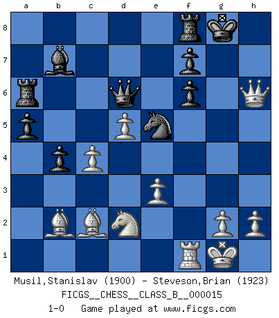 Last move : 1-0 2007 March 19 3:55:4 [Event "FICGS__CHESS__CLASS_B__000015"] [Site "FICGS"] [Date "2007.02.05"] [Round "1"] [White "Musil,Stanislav"] [Black "Steveson,Brian"] [Result "1-0"] [WhiteElo "1900"] [BlackElo "1923"] 1.Nf3 d5 2.c4 c6 3.d4 e6 4.Nc3 dxc4 5.e3 b5 6.a4 Bb4 7.Bd2 a5 8.axb5 Bxc3 9.Bxc3 cxb5 10.b3 Bb7 11.bxc4 b4 12.Bb2 Nf6 13.Bd3 Nbd7 14.O-O O-O 15.Nd2 e5 16.d5 Nc5 17.Bc2 Qd6 18.f4 exf4 19.Rxf4 Ncd7 20.Qf3 Ne5 21.Qh3 h6 22.Raf1 Ra6 23.Rxf6 gxf6 24.Qxh6 1-0 Reti Opening Kingside Castling by player White (move 14) Kingside Castling by player Black (move 14) Player White won this chess game. Follow this game move after move (download)When asked, -How is that you pick better moves than your opponents?, I responded: I'm very glad you asked me that, because, as it happens, there is a very simple answer. I think up my own moves, and I make my opponent think up his. (Alexander Alekhine) Modernes Schach sorgt sich zuviel um Dinge wie Bauernstruktur usw. Vergessen Sie das, Schachmatt beendet das Spiel! (Nigel Short) Hay jugadores fuertes y personas amables y yo soy un jugador fuerte. (Bobby Fischer) Le joueur d'Echecs qui veut atteindre le top est obligé de développer son propre credo créatif. Alexeï Stepanovicth Souétine. Il est facile d'écrire des livres ! Ce qui est difficile, c'est de jouer ! (Alexeï Stepanovicth Souétine) Dave, my mind is going. I can feel it. (HAL 9000 in 2001, a space odyssey)