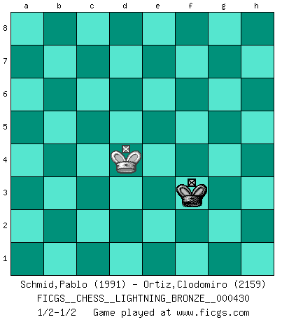 Last move : 1/2-1/2 2013 July 24 23:37:11 [Event "FICGS__CHESS__LIGHTNING_BRONZE__000430"] [Site "FICGS"] [Date "2013.07.24"] [Round "1"] [White "Schmid,Pablo"] [Black "Ortiz,Clodomiro"] [Result "1/2-1/2"] [WhiteElo "1991"] [BlackElo "2159"] 1.e4 e5 2.Nf3 Nc6 3.Bc4 Nf6 4.d4 exd4 5.e5 d5 6.Bb5 Ne4 7.Nxd4 Bd7 8.Bxc6 bxc6 9.O-O Bc5 10.f3 Ng5 11.Be3 O-O 12.f4 Ne6 13.c3 Re8 14.Nd2 Bb6 15.Qf3 Nf8 16.a4 a5 17.Qf2 Qe7 18.N4b3 Rab8 19.Bd4 Bf5 20.Bxb6 Rxb6 21.Nxa5 c5 22.c4 d4 23.Nab3 Rg6 24.Qe2 Rb8 25.a5 Ra6 26.Qf3 Nd7 27.Ra3 h6 28.Qd5 Kh7 29.Rfa1 Qf8 30.h3 g6 31.g4 Be6 32.Qf3 Qe7 33.Ra4 Kg7 34.Qg3 Kh8 35.Kh2 f6 36.exf6 Qxf6 37.Ne4 Qf8 38.Re1 Kh7 39.Re2 Rba8 40.Ned2 Re8 41.Kg1 Bf7 42.Rxe8 Qxe8 43.Ra1 Re6 44.Nf1 Qb8 45.Qf3 Re8 46.a6 Bxc4 47.a7 Qa8 48.Qxa8 Rxa8 49.Nfd2 Bf7 50.Kf2 Kg7 51.Ra5 h5 52.Ke2 Be6 53.gxh5 gxh5 54.h4 Kg6 55.Kd3 c6 56.Nc1 Bd5 57.Ne2 Kf5 58.b4 cxb4 59.Kxd4 Kg4 60.Nc4 Kxh4 61.Ne3 Bf3 62.Nf5+ Kg4 63.Ne3+ Kh3 64.Ng1+ Kg3 65.Nf5+ Kxf4 66.Nxf3 c5+ 67.Kc4 Kxf3 68.Ra1 Nb6+ 69.Kxc5 Nc8 70.Kxb4 Rxa7 71.Rxa7 Nxa7 72.Kc4 Nc6 73.Kd3 Ne7 74.Nd4+ Kg2 75.Ke2 Kg3 76.Kd2 Kf2 77.Ne6 h4 78.Ng5 Nf5 79.Nh3+ Kg3 80.Ng5 Kg4 81.Ne4 Ng3 82.Nf2+ Kf3 83.Nh3 Nh5 84.Ke1 Kg2 85.Ng5 Nf4 86.Kd2 Nh3 87.Ne6 Kf2 88.Kd3 Ng1 89.Ng5 Nf3 90.Nh3+ Kg2 91.Ke3 Kg3 92.Nf2 Nd2 93.Nh1+ Kg2 94.Nf2 h3 95.Nxh3 Kxh3 96.Kxd2 Kg3 97.Ke3 Kg2 98.Kd4 Kf3 99.Kd3 Kf4 100.Kd4 Kf3 101.Kd3 Kf4 102.Kd4 Kf3 1/2-1/2 Two knights defense Kingside Castling by player White (move 9) Kingside Castling by player Black (move 11) 10 pieces endgame at move 67 : White KRNP , Black KRNPPP WHITE : King + 1 Rook 1 Knight 1 Pawn BLACK : King + 1 Rook 1 Knight 3 Pawns 9 pieces endgame at move 69 : White KRNP , Black KRNPP WHITE : King + 1 Rook 1 Knight 1 Pawn BLACK : King + 1 Rook 1 Knight 2 Pawns 8 pieces endgame at move 70 : White KRNP , Black KRNP WHITE : King + 1 Rook 1 Knight 1 Pawn BLACK : King + 1 Rook 1 Knight 1 Pawn 7 pieces endgame at move 70 : White KRN , Black KRNP WHITE : King + 1 Rook 1 Knight BLACK : King + 1 Rook 1 Knight 1 Pawn 6 pieces endgame at move 71 : White KRN , Black KNP WHITE : King + 1 Rook 1 Knight BLACK : King + 1 Knight 1 Pawn 5 pieces endgame at move 71 : White KN , Black KNP WHITE : King + 1 Knight BLACK : King + 1 Knight 1 Pawn 4 pieces endgame at move 95 : White KN , Black KN WHITE : King + 1 Knight BLACK : King + 1 Knight 3 pieces endgame at move 95 : White K , Black KN WHITE : King + BLACK : King + 1 Knight 2 pieces endgame at move 96 : White K , Black K WHITE : King + BLACK : King + This chess game ended in a draw. Follow this game move after move (download)The older I grow, the more I value pawns. (Paul Keres) Ich glaube, ich kenne inzwischen die Gründe für mein Versagen: schachliche Charakterfehler. Ich war nie ein Wunderkind und in meiner gesamten menschlichen Entwicklung immer zu langsam. (Viktor Kortschnoi) Yo no le temo a Spassky. Todos saben que yo soy el mejor. Uno no necesita un torneo para probarlo. (Bobby Fischer) Karpov est une pièce de musée. (Garry Kasparov) Patience, use the Force, think ! (Obi-Wan Kenobi in Star Wars ep.2)