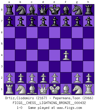 Last move : 1-0 2013 July 25 17:42:9 [Event "FICGS__CHESS__LIGHTNING_BRONZE__000432"] [Site "FICGS"] [Date "2013.07.25"] [Round "1"] [White "Ortiz,Clodomiro"] [Black "Pepermans,Toon"] [Result "1-0"] [WhiteElo "2167"] [BlackElo "2066"] 1.f4 1-0 This chess game has been lost on time (started : 2013.07.25 16:23:9) Bird's Opening Player White won this chess game. Follow this game move after move (download)A passed Pawn increases in strength as the number of pieces on the board diminishes. (Capablanca) Dass jemand wie Surab Asmaiparaschwili, der selbst Elopunkte gekauft hat , Vize-Präsident der Fide werden konnte, sagt schon einges über den Zustand dieser Organisation aus. (Joel Lautier) Una buena memoria, concentración, imaginación y una fuerte voluntad, se requiere para llegar a ser un buen jugador. (Bobby Fischer) L'action d'une oeuvre littéraire se déroule sur un champ de bataille. Les masques et les types du drame moderne correspondent aux pièces du jeu d'échecs. L'intrigue correspond aux coups et aux gambits, c'est à dire aux techniques du jeu telles qu'utilisées et interprétées par les joueurs. Les tactiques et les péripéties [mouvements] correspondent aux coups exécutés par l'adversaire. (Viktor Shklovsky) Somewhere in the world there is an epigram for every dilemma. (Hendrik Willem van Loon)