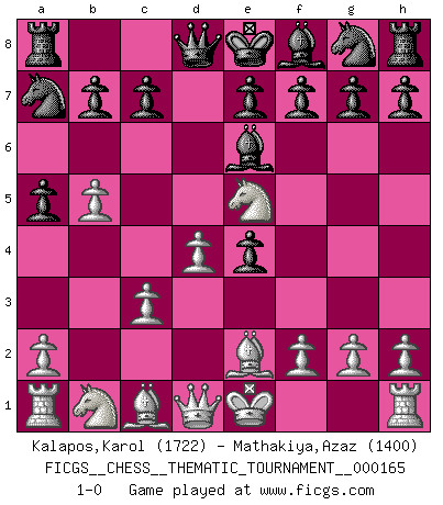 Last move : 1-0 2013 September 6 18:13:3 [Event "FICGS__CHESS__THEMATIC_TOURNAMENT__000165"] [Site "FICGS"] [Date "2013.07.25"] [Round "1"] [White "Kalapos,Karol"] [Black "Mathakiya,Azaz"] [Result "1-0"] [WhiteElo "1722"] [BlackElo "1400"] 1.b4 a6 2.Nf3 Nc6 3.d4 d5 4.c3 a5 5.b5 Na7 6.e4 dxe4 7.Ne5 Be6 8.Be2 1-0 Polish (Sokolsky) opening Player White won this chess game. Follow this game move after move (download)When asked, -How is that you pick better moves than your opponents?, I responded: I'm very glad you asked me that, because, as it happens, there is a very simple answer. I think up my own moves, and I make my opponent think up his. (Alexander Alekhine) Der Umstand, daß uns eine 7 Stunden Zeitkontrolle ermöglicht eine großartige, tiefe Partie zu spielen, ist für die Massenmedien nicht weiter von Bedeutung. (Alexej Shirov) Prefiero perder una partida realmente buena, que ganar una mala. (David Levy) A ce moment-là, je menaçais de comprendre la position ! (Clément L'Heureux) All men can see these tactics whereby I conquer, but what none can see is the strategy out of which victory is evolved. (Sun Tzu)