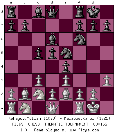 Last move : 1-0 2013 October 30 5:10:37 [Event "FICGS__CHESS__THEMATIC_TOURNAMENT__000165"] [Site "FICGS"] [Date "2013.07.25"] [Round "1"] [White "Kehayov,Yulian"] [Black "Kalapos,Karol"] [Result "1-0"] [WhiteElo "1079"] [BlackElo "1722"] 1.b4 Nf6 2.Bb2 e6 3.e3 Bxb4 4.Bc3 Nc6 5.Bb2 d5 6.c3 Bd6 7.Nf3 e5 8.Be2 e4 9.Nd4 Ne5 10.O-O O-O 11.h3 c5 12.Nc2 1-0 This chess game has been lost on time (started : 2013.07.25 16:50:14) Polish (Sokolsky) opening Kingside Castling by player White (move 10) Kingside Castling by player Black (move 10) Player White won this chess game. Follow this game move after move (download)Chess demands total concentration. (Bobby Fischer) Ich kenne Menschen, die allen Willen der Welt besitzen und doch nicht Schach spielen können. (Robert James Fischer) Aún deseo matar a Fischer. (Boris Spassky) Toutes les manuvres exécutées sur une colonne ouverte ont pour but ultime l'intrusion définitive sur la septième ou la huitième rangée, en plein cur de la position ennemie. (Aaron Nimzovitch) Perception is reality. (Immanuel Kant)